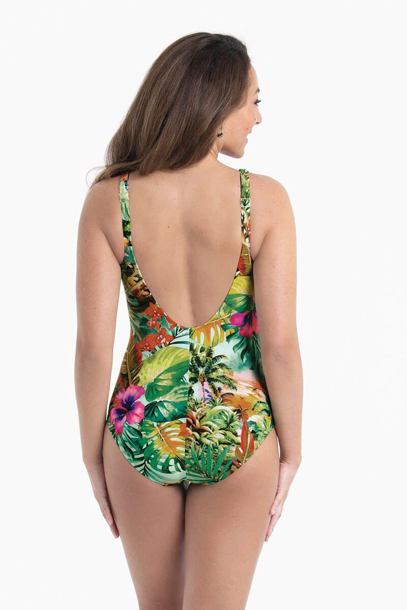 Het Anita Badpak Camilla Paradise Island is uitgevoerd in een tropische print met groene bladeren, palmbomen en felgekleurde bloemen in tinten rood, oranje, roze en paars op een frisse, lichtgroene achtergrond. Dit badpak laat je taille mooier uitkomen en de stof zorgt voor een slanker effect. Het heeft een hartvormige hals en door de plooitjes en het metalen detail wordt je decolleté mooi benadrukt. Dankzij de verstelbare bandjes en de ingebouwde cups zit het badpak ook nog eens heel comfortabel.