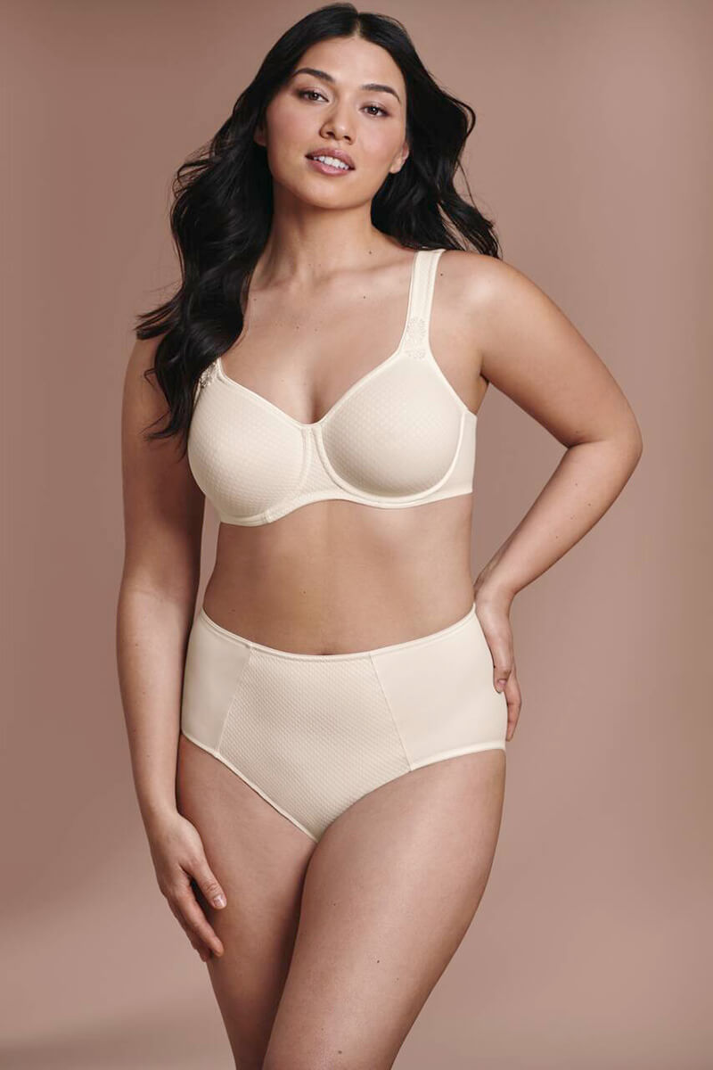 De Anita Leni Hele cup BH Crystal 5884 in een ivoor kleurige jacquard stof. Deze BH tekent niet af onder nauwsluitende kleding dankzij de naadloze dubbellaagse cups. Door het licht elastische materiaal in de cups sluit de Leni beugelBH altijd mooi aan, ook als je borsten niet geheel gelijk zijn. Deze BH is niet voorgevormd. Een extra cup steun is ingebracht voor de grotere maten. De schouderbanden zijn extra breed en versterkt voor meer comfort. Gebaseerd op de Rosa Faia Twin.