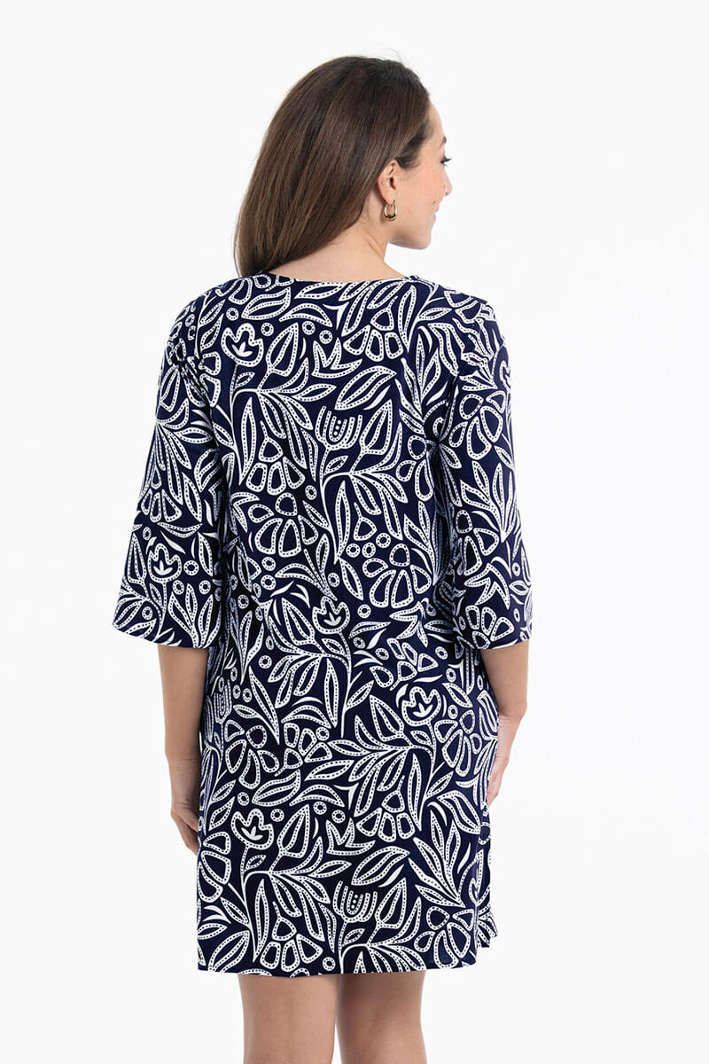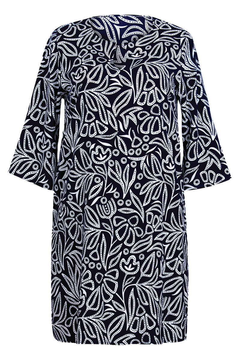 De Anita Tuniek Salla Flower Dots is uitgevoerd is uitgevoerd in witte bloemen met stippen op een donkerblauwe achtergrond. De halslijn legt op subtiele wijze de nadruk op het decolleté, terwijl de ¾-mouwen en luchtige zijsplitten aan de mouwen en zoom zorgen voor een genoeg bewegingsvrijheid, ideaal voor zonnige dagen aan het strand.