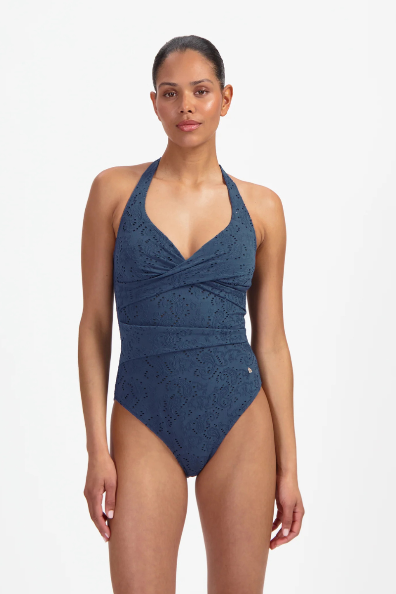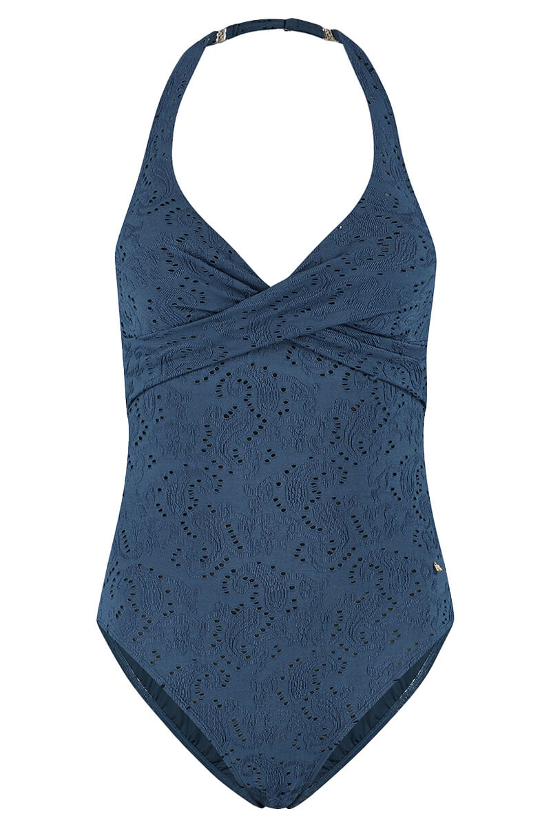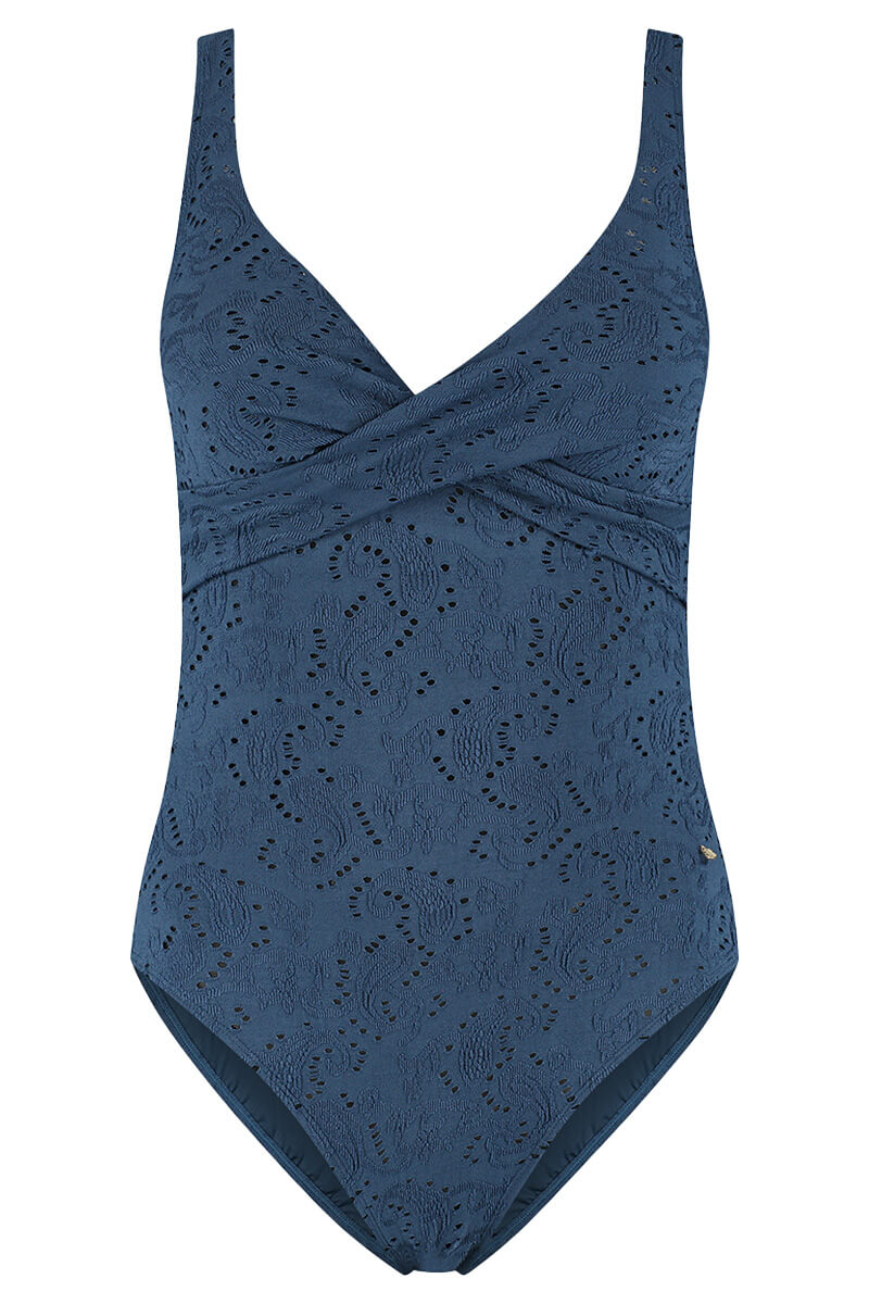 Het Beachlife Badpak Nightsky Embroidery is uitgevoerd in een romantisch donkerblauw broderie. Het badpak heeft een ingebouwd topje van mesh met uitneembare padded cups. Er is een handig kliksysteem toegevoegd aan de nekbanden, zodat je het badpak kunt dragen als halter of over de schouder. Door de (vaste) overslag en het shaping gedeelte binnenin verdoezelt het een buikje.