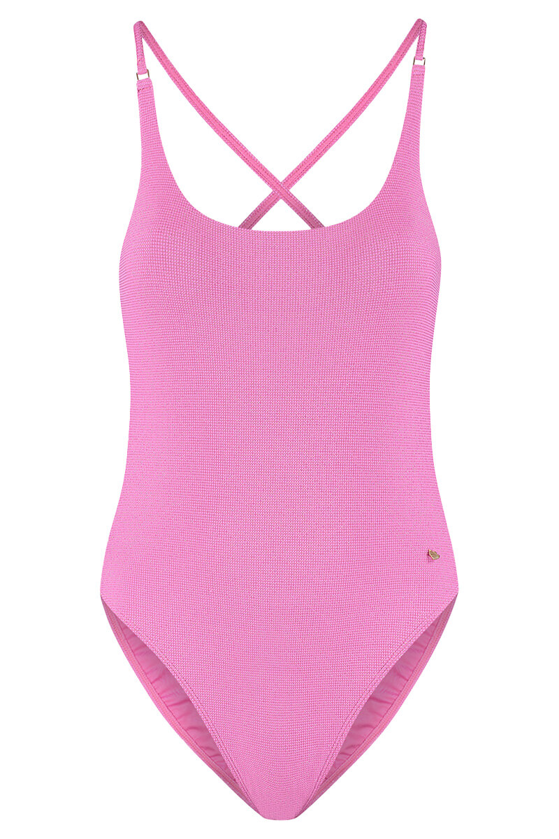 Het Beachlife Badpak Pink Shimmer is uitgevoerd in een mooie roze trendkleur gecombineerd met een subtiele sparkling, dankzij het lurex draad. De dunne schouderbandjes en striksluiting midden op de rug zorgen ervoor dat je het badpak precies kunt laten aansluiten op jouw lichaam. Het model is voorzien van uitneembare foampads voor een natuurlijke, comfortabele pasvorm.