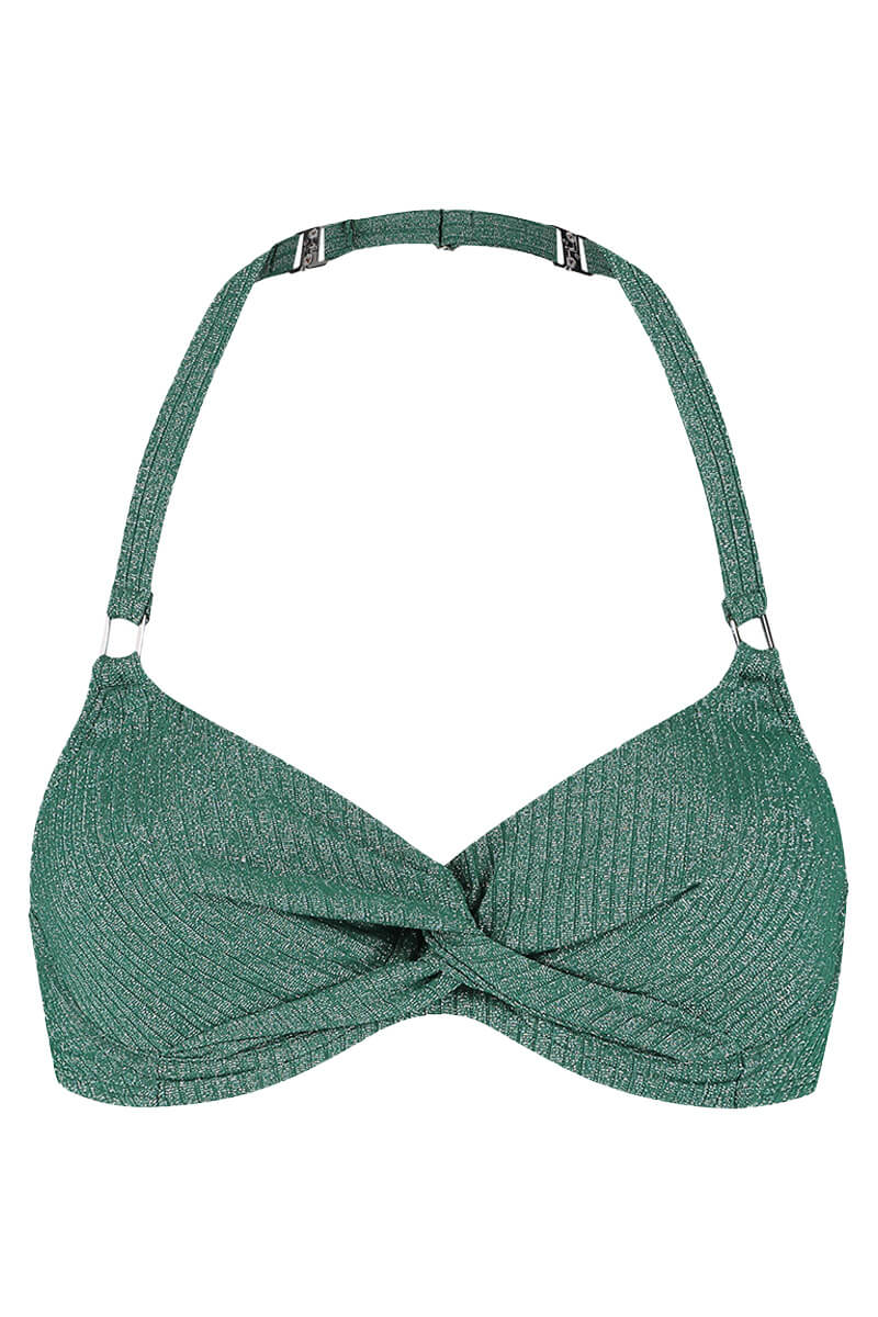 De Beachlife Bikini top Green Glitter is uitgevoerd in een donkergroene glitterstof met een subtiele glans en een fijne ribstructuur. De bikintop is niet voorgevormd en heeft een beugel. De pasvorm van deze bikini is speciaal ontworpen voor de grotere cupmaten. Ook kun je deze bikini top als halter dragen.