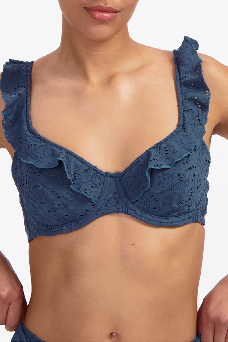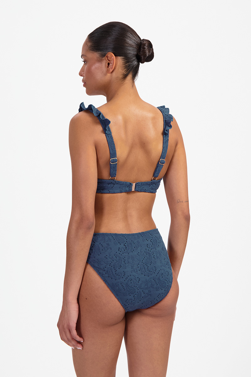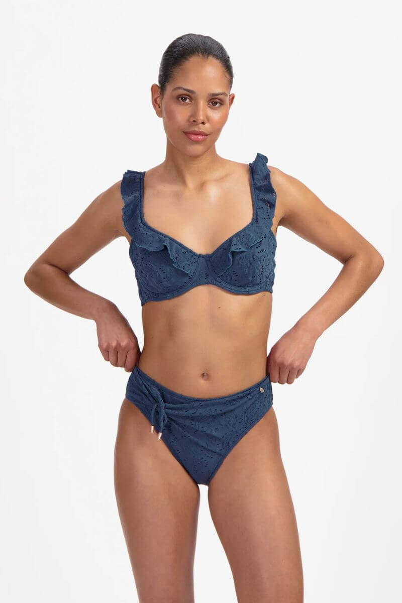 De Beachlife Bikini top Nightsky Embroidery is uitgevoerd in een romantisch donkerblauw broderie. De bikintop is niet voorgevormd en heeft een beugel. Langs de cups en de schouderbandjes loopt een lief roesje. De pasvorm van deze bikini is speciaal ontworpen voor de grotere cupmaten.