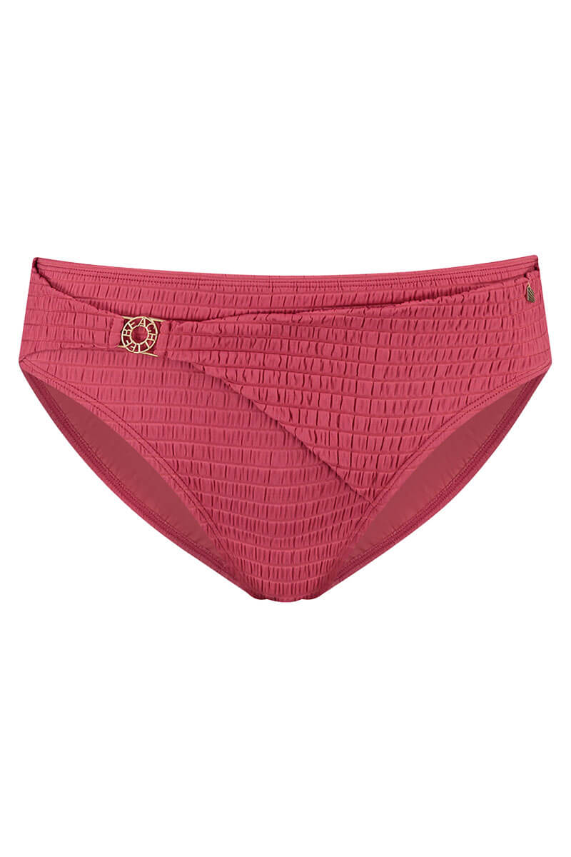 De Beachlife Bikinislip Berry is uitgevoerd in een effen berry-roze kleur met een gestructureerde, gesmokte stof. De stof heeft een subtiele horizontale ribstructuur, wat zorgt voor een speels en licht reliëf in het materiaal, Aan de voorkant heeft de bikinislip een extra stukje stof die aan de zijkant bij elkaar word gebonden zilveren ring met het Beachlife logo. Het broekje valt wat hoger op de heupen.