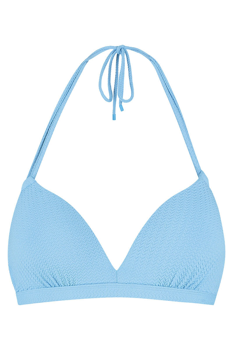 De Beachlife Halter bikini top Alaskan Blue is uitgevoerd in een zachte, lichtblauwe kleur met een subtiele ingeweven structuur. Een bestseller vanwege zijn sexy en comfortabele pasvorm. De top is gewatteerd en voorzien van een beugel. Dit model geeft een subtiel push-up effect dankzij de halterbandjes en de vorm van de foampads.