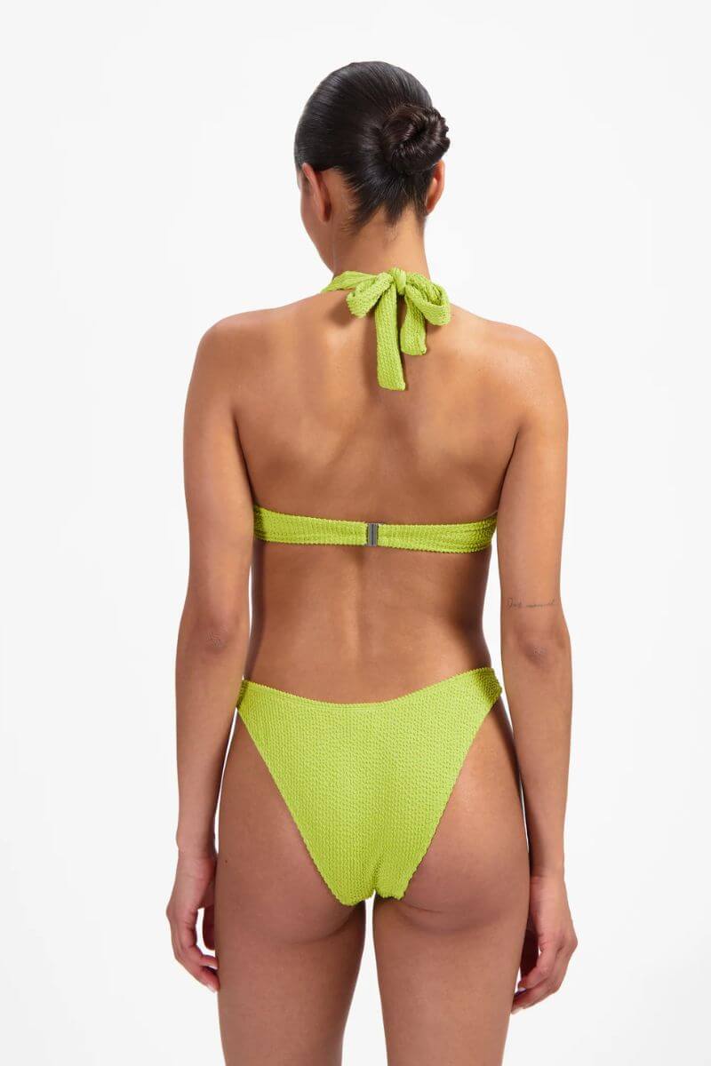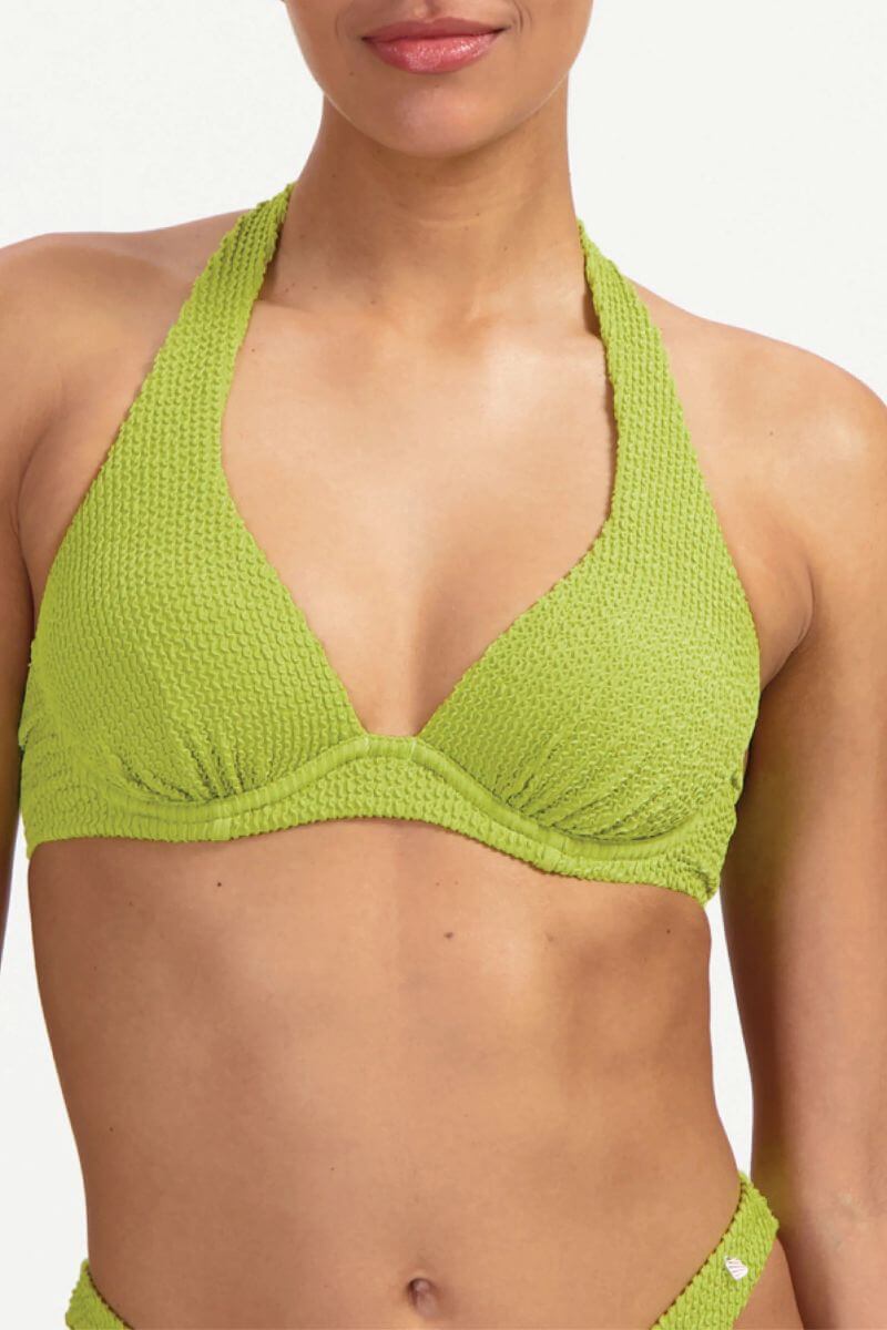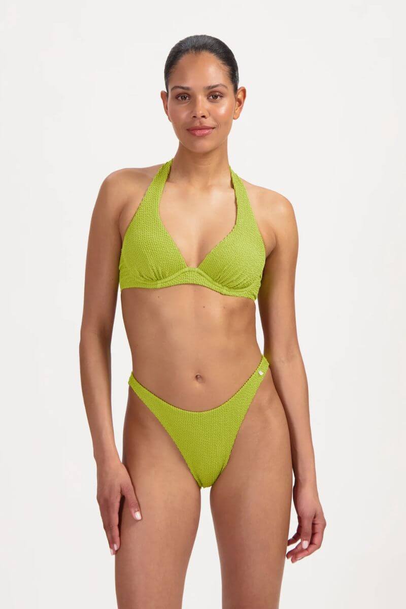 De Beachlife Halter bikini top Pistache is uitgevoerd in een hippe, groene pistache ribstof. De top is voorgevormd en voorzien van een beugel, wat zorgt voor goede ondersteuning en een mooie vorm. Dankzij de demi-padding en het diepe decolleté creëert deze haltertop een vrouwelijke en sexy look.