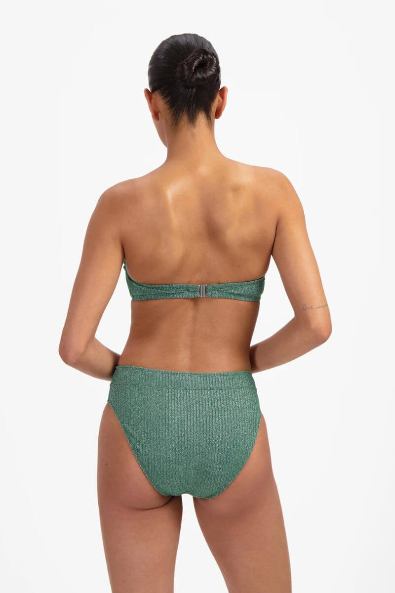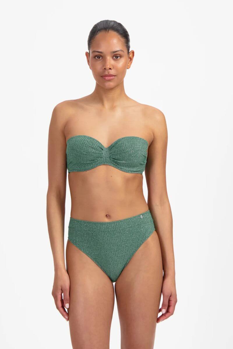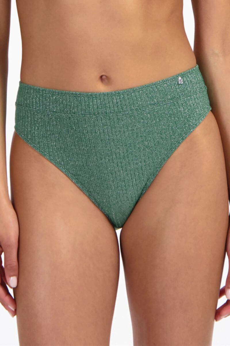 De Beachlife High waist bikinislip Green Glitter is uitgevoerd in een donkergroene glitterstof met een subtiele glans en een fijne ribstructuur. Het broekje valt hoog op de heupen en is bij de benen hoog uitgesneden waardoor er een toffe retro look wordt gecreëerd.