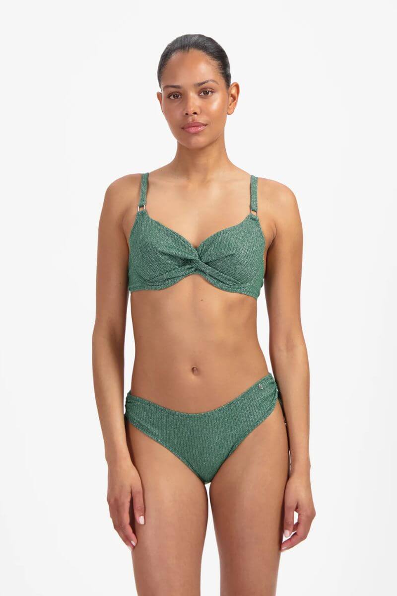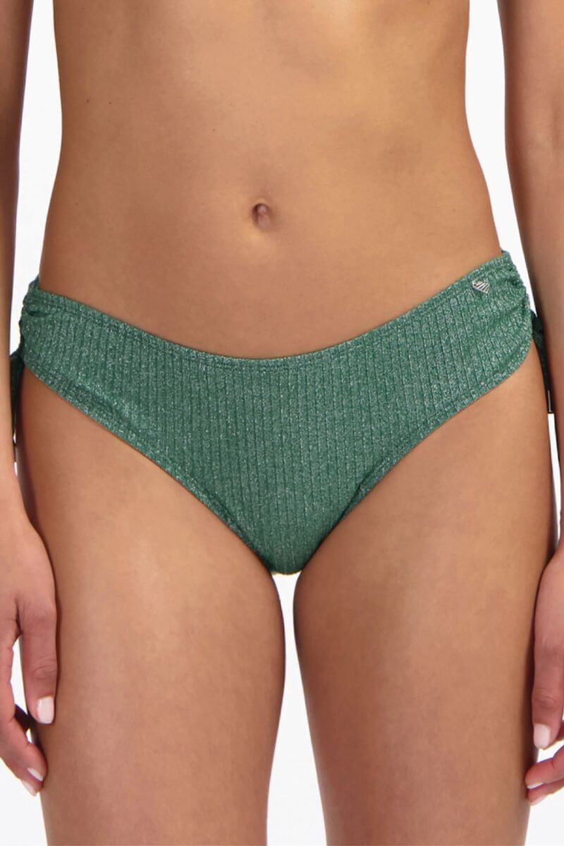 De Beachlife Rijgslip Green Glitter is uitgevoerd in een donkergroene glitterstof met een subtiele glans en een fijne ribstructuur. Met de koordjes aan de zijkant kun je de bikinislip iets aanrijgen.