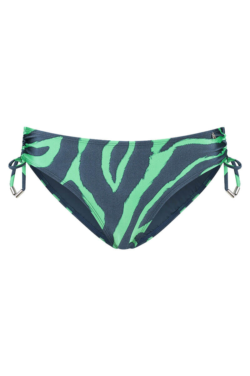 De Beachlife Rijgslip Green Tiger is uitgevoerd in een groene en donkerblauwe tijgerprint. Met de koordjes aan de zijkant kun je de bikinislip iets aanrijgen.