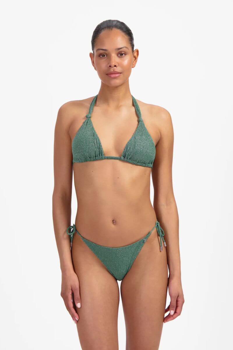 De Beachlife Strikslip Green Glitter is uitgevoerd in een donkergroene glitterstof met een subtiele glans en een fijne ribstructuur. Met de koordjes aan de zijkant strik je je bikinislip zoals jij het fijn vindt.