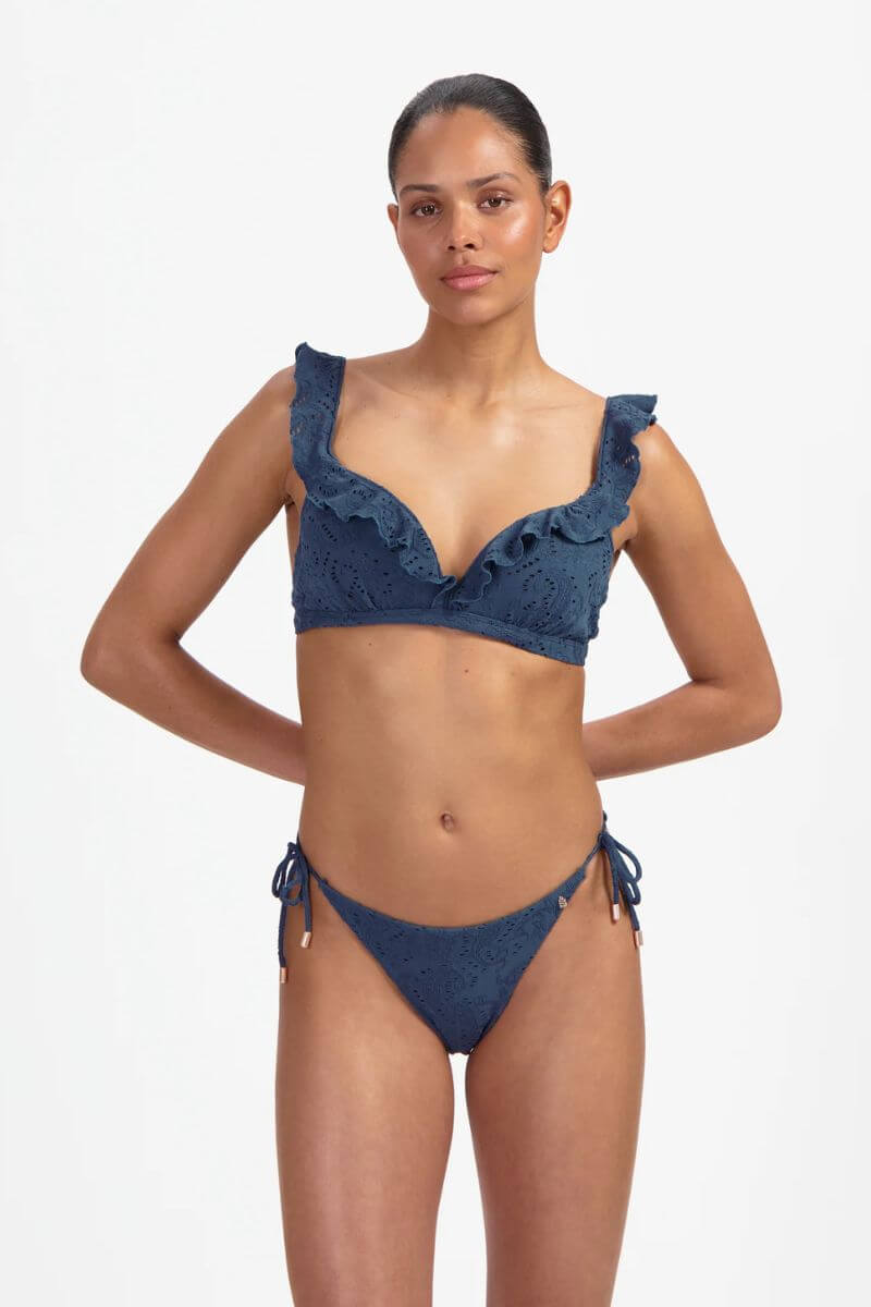 De Beachlife Strikslip Nightsky Embroidery is uitgevoerd in een romantisch donkerblauw broderie. Met de koordjes aan de zijkant strik je je bikinislip zoals jij het fijn vindt.