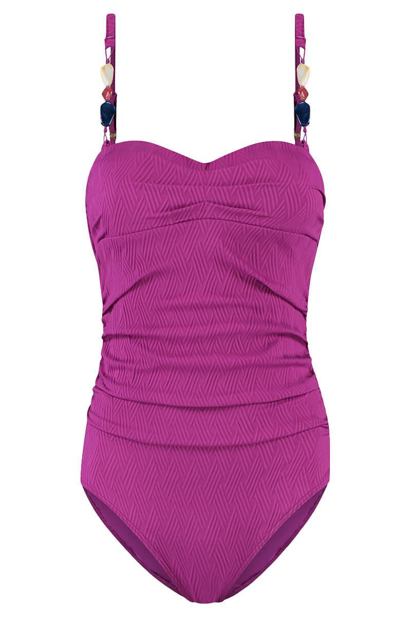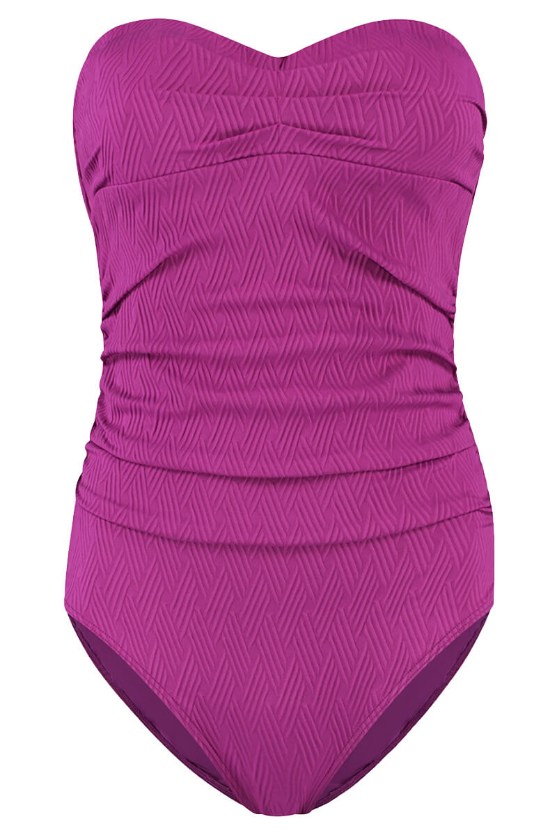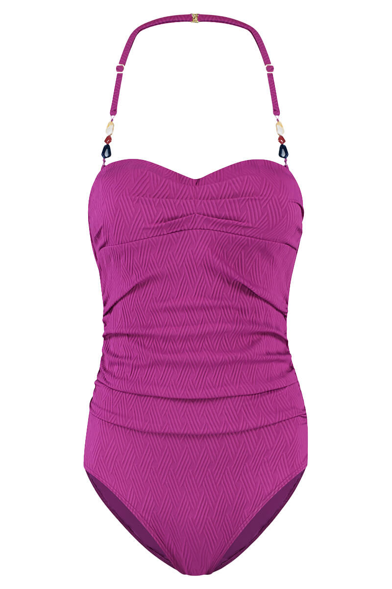 De Cyell Badpak Texture Viola is uitgevoerd in een subtiel ingeweven zigzag patroon in een effen, fuchsia kleur. Dit multi-way badpak kun je strapless, als halter of met schouderbandjes dragen. De voorgevormde cups zonder beugel bieden comfortabele ondersteuning, ook strapless. De plooitjes bij de buik geven een flatterend effect en het badpak is afgewerkt met subtiele steentjes.