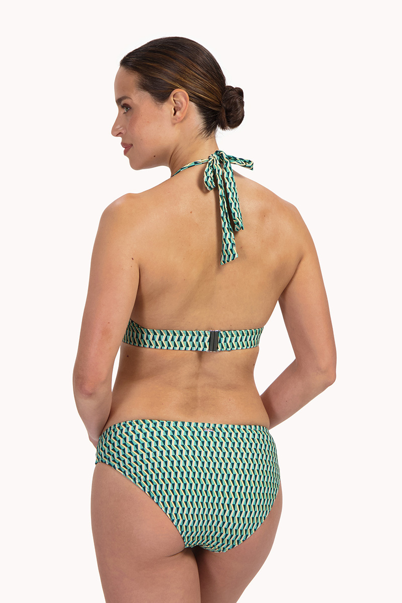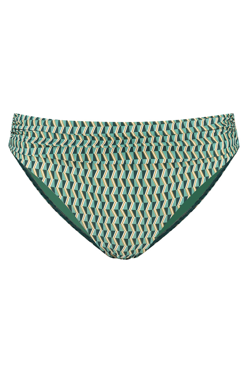 De Cyell Bikinislip Groovy Graphic is uitgevoerd in een vrolijke retroprint met tinten groen, turquoise, geel en wit. Aan de voorzijde is een band met flatterende plooitjes toegevoegd voor een speels en licht corrigerend effect.
