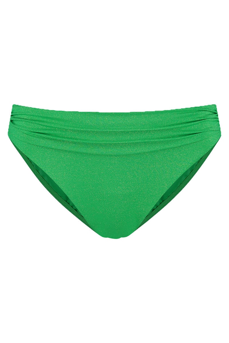 De Cyell Bikinislip Sparkling is uitgevoerd in groen met subtiele glinsteringen die door de stof lopen. Aan de voorzijde is een band met flatterende plooitjes toegevoegd voor een speels en licht corrigerend effect.
