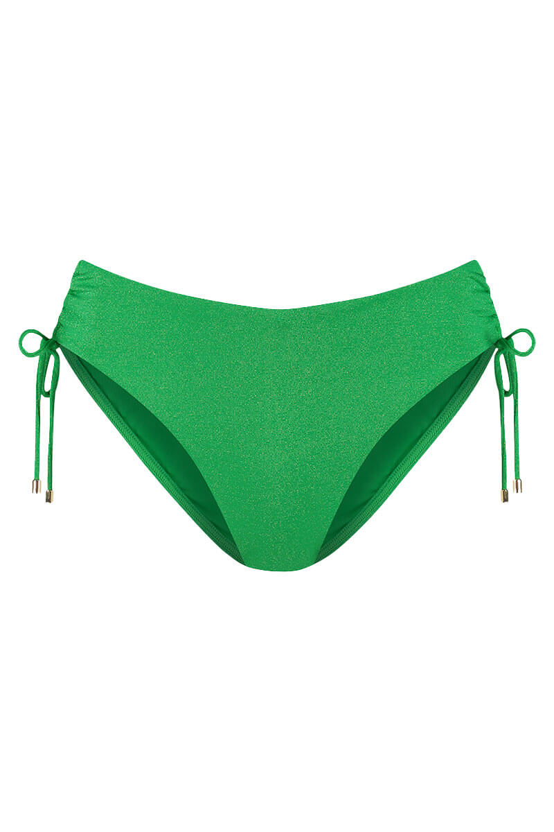De Cyell High Leg Bikinislip Sparkling is uitgevoerd in groen met subtiele glinsteringen die door de stof lopen. Dit hoog uitgesneden bikinibroekje heeft een elegante V-shape bij de taille en verstelbare strikkoordjes aan de zijkanten.