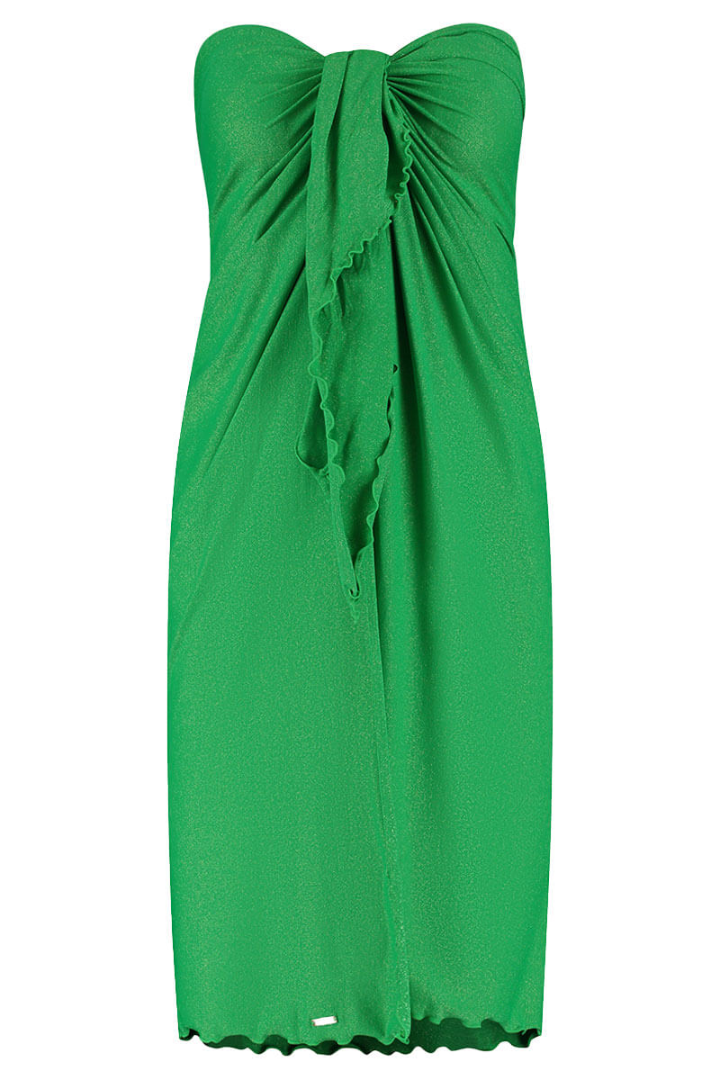 De Cyell Pareo Sparkling is uitgevoerd in groen met subtiele glinsteringen die door de stof lopen. De stof is gemaakt van badkledingmateriaal en heeft een lichte, soepelvallende stof. De pareo is afgewerkt met speelse ruches en kan op verschillende manieren gedragen worden, bijvoorbeeld als rok of als jurk.