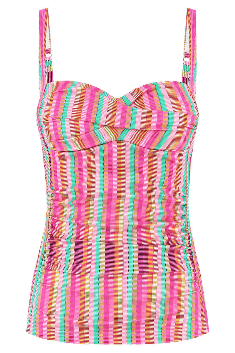 De Cyell Tankinitop Tropical Lines is uitgevoerd in een vrolijke, verticale streepprint met frisse kleuren zoals roze, turquoise, geel en oranje. De top heeft voorgevormde cups zonder beugel, wat zorgt voor een comfortabele pasvorm. De brede, verstelbare schouderbandjes en flatterende zijpanelen geven extra steun. De tankini is gevoerd met power mesh voor een mooi aansluitende fit. Dankzij de hoge cups en subtiele plooitjes krijgt je silhouet een mooie, elegante vorm.