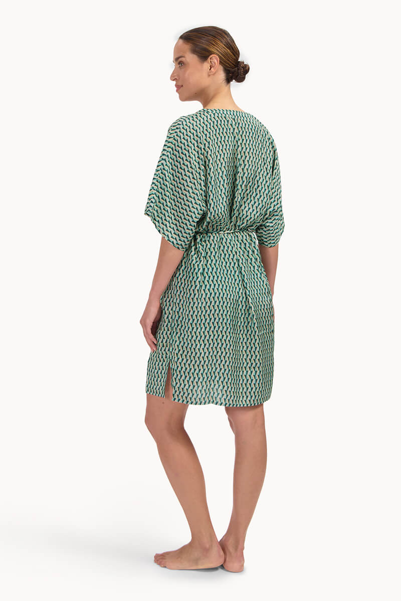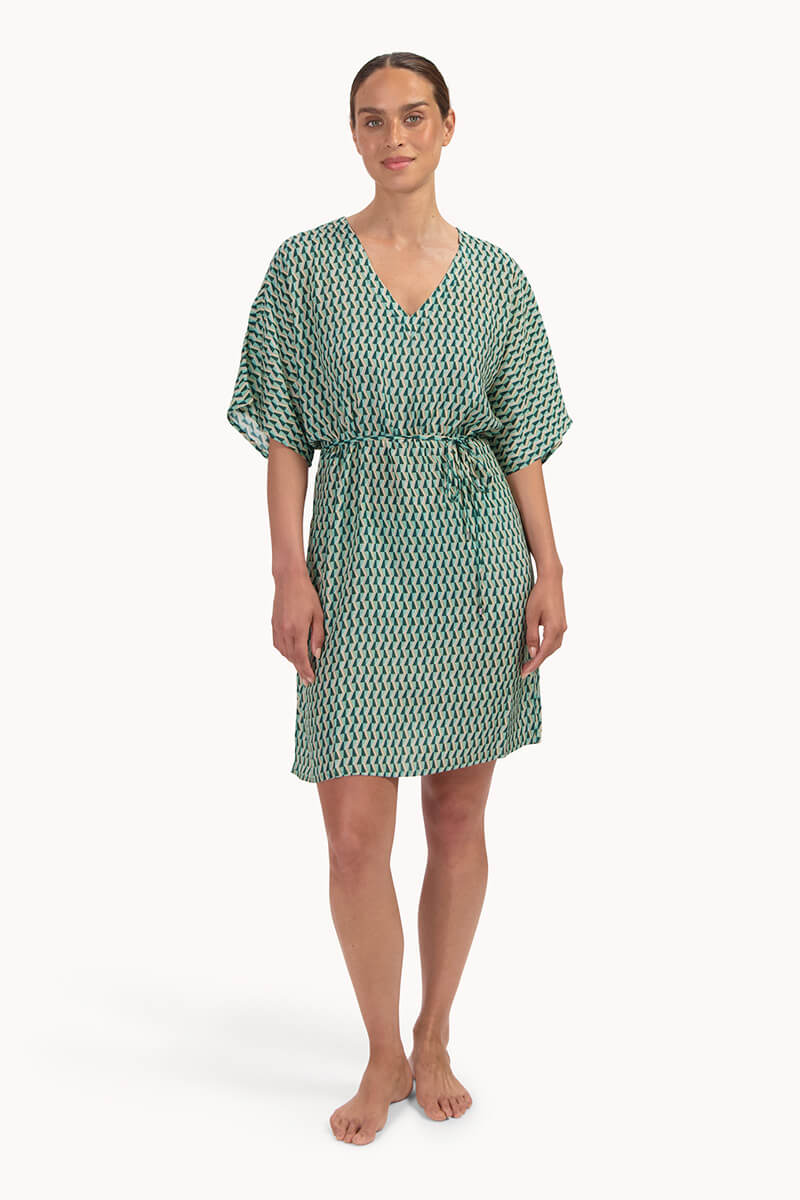 De Cyell Tuniek Groovy Graphic is uitgevoerd in een vrolijke retroprint met tinten groen, turquoise, geel en wit. De tuniek is luchtig en heeft brede vlindermouwen en een diepe V-hals voor een relaxte pasvorm. Met het koordje in de taille kun je de pasvorm helemaal naar wens aantrekken. Perfect om over je bikini of badpak te dragen.