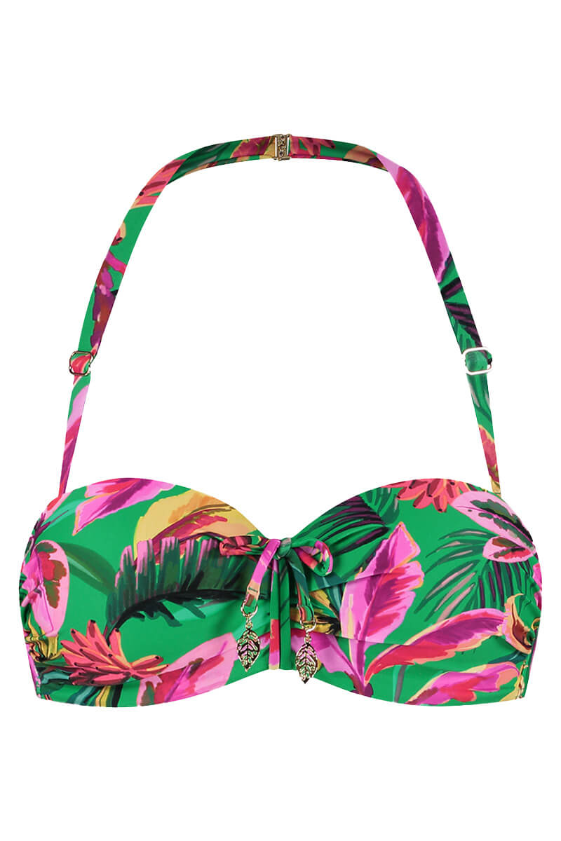 De Cyell Voorgevormde bandeau bikini top Floral Forest is uitgevoerd in een tropische bloemen- en bladprint op een felgroene basis, met accenten in roze, fuchsia, geel, oranje en verschillende tinten groen. De bikinitop is voorzien van beugels voor voldoende steun. Je borsten worden prachtig gevormd in deze bandeau bikini. Deze multiway bikinitop draag je strapless, als halter of gewoon met schouderbandjes. Leuk te combineren met een van de bijpassende slips uit de Floral Forest serie van Cyell.