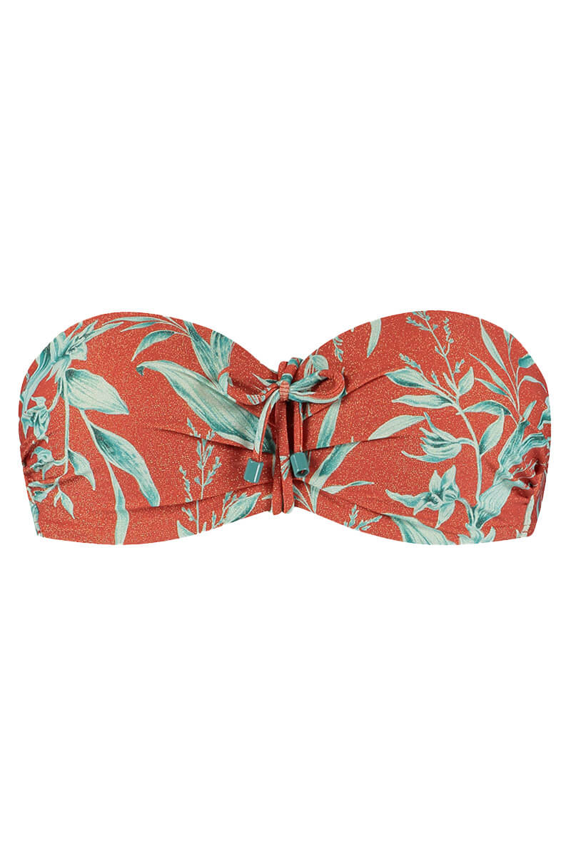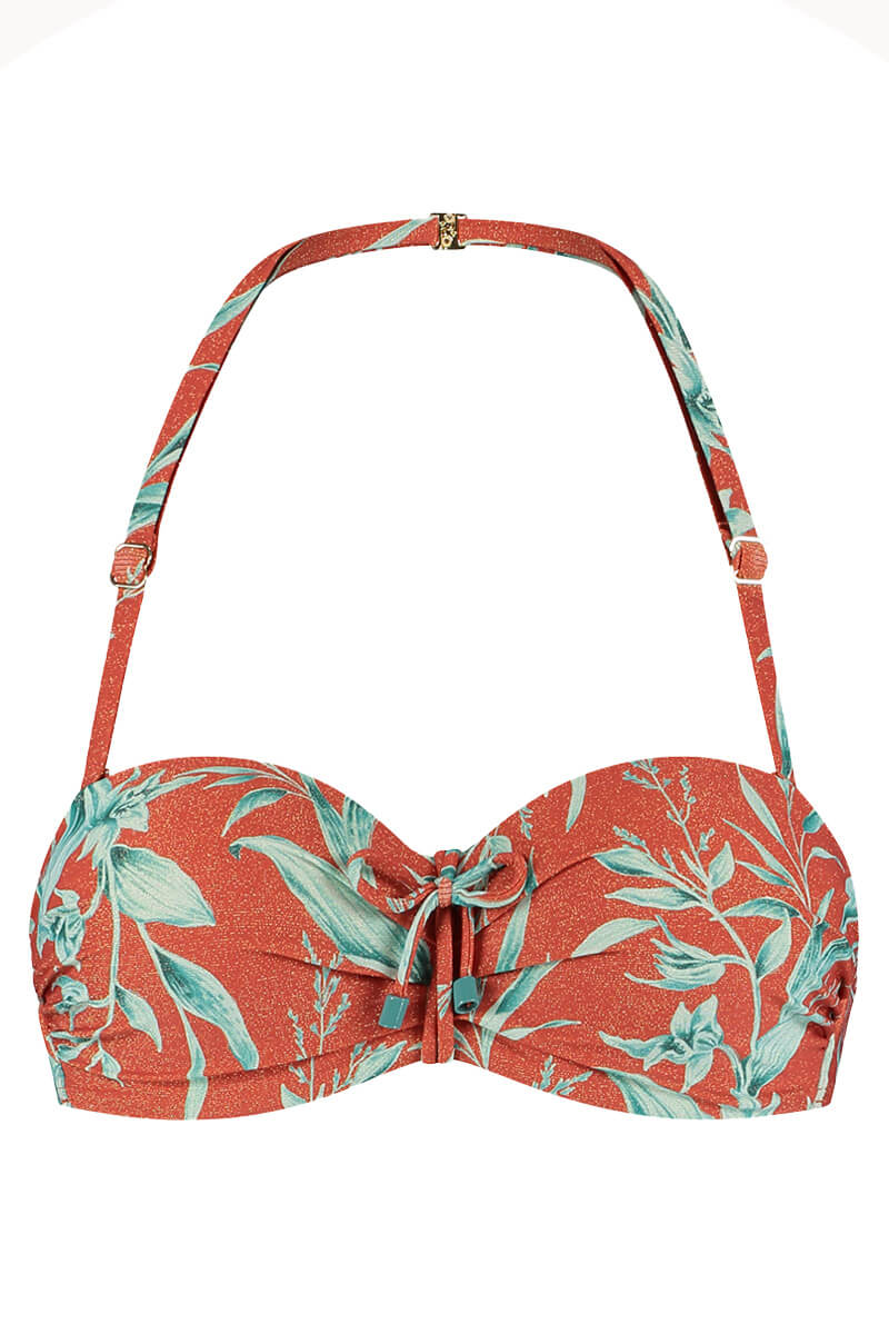 De Cyell Voorgevormde bandeau bikini top Rusty Rose is uitgevoerd in een warme roestkleur met subtiele glitter en een tropische bladprint in frisse turquoise tinten. De bikinitop is voorzien van beugels voor voldoende steun. Je borsten worden prachtig gevormd in deze bandeau bikini. Deze multiway bikinitop draag je strapless, als halter of gewoon met schouderbandjes. Leuk te combineren met een van de bijpassende slips uit de Rusty Rose serie van Cyell.