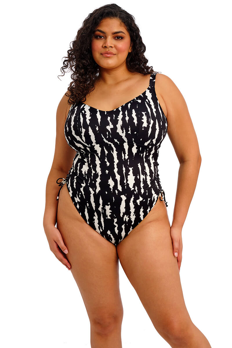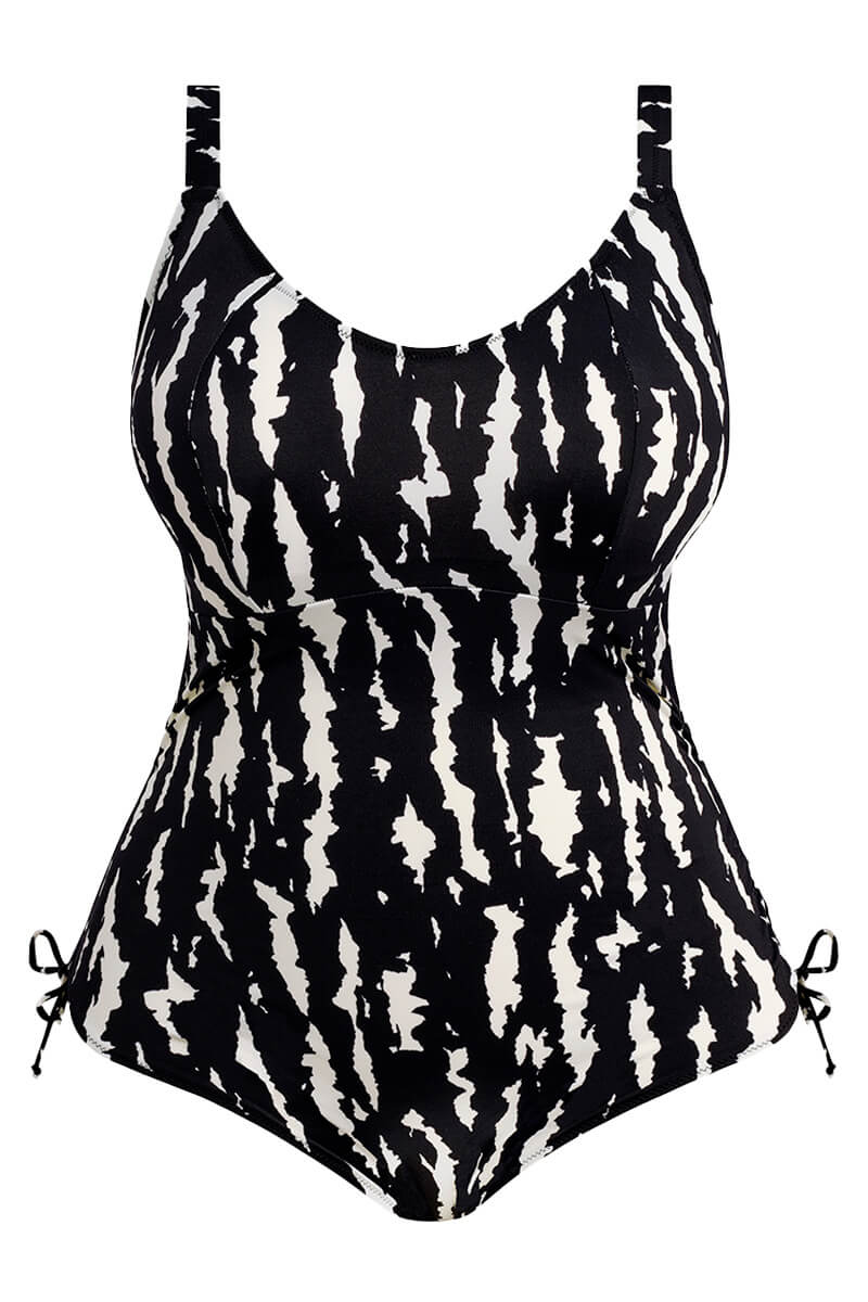 De Elomi Echo Shell Badpak Black is uitgevoerd in een leuke zwart-witte print. Dit badpak geeft goede steun en een mooie vorm, zonder dat er voorgevormde cups in zitten. Binnenin zit een brede, stevige band die alles comfortabel op z’n plek houdt. De achterkant heeft een lage uitsnijding met een sluiting, zodat je het badpak makkelijk aan- en uittrekt. Aan de zijkanten kun je de hoogte zelf verstellen voor meer of minder bedekking. De schouderbandjes zijn verstelbaar voor een fijne, persoonlijke pasvorm.