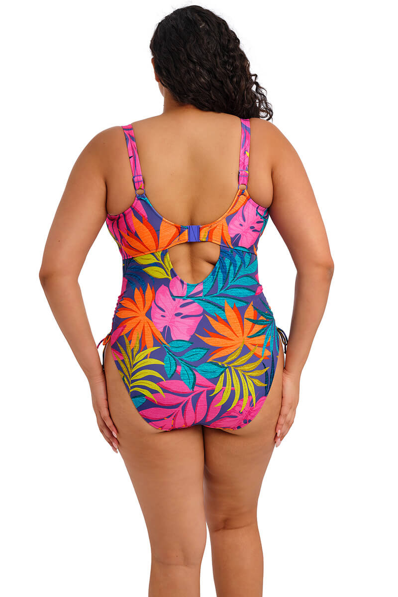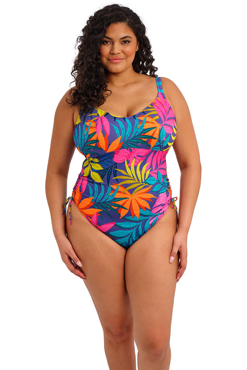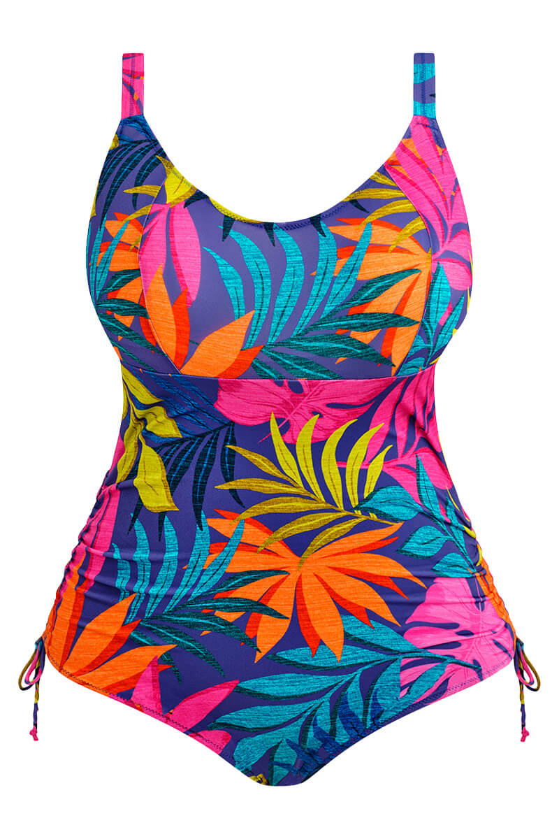De Elomi Porto Rafti Badpak Indigo is uitgevoerd in een diepe indigoblauwe kleur met een levendige tropische print in fuchsia, oranje en groentinten. Dit badpak geeft goede steun en een mooie vorm, zonder dat er voorgevormde cups in zitten. Binnenin zit een brede, stevige band die alles comfortabel op z’n plek houdt. De achterkant heeft een lage uitsnijding met een sluiting, zodat je het badpak makkelijk aan- en uittrekt. Aan de zijkanten kun je de hoogte zelf verstellen voor meer of minder bedekking. De schouderbandjes zijn verstelbaar voor een fijne, persoonlijke pasvorm.