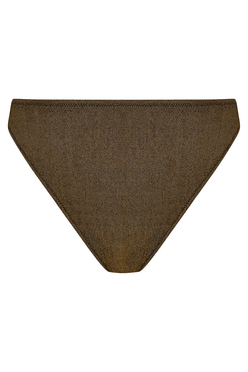 De Elomi Sunset Shimmer High Leg Bikinislip Gold Rush is uitgevoerd in een goudkleurige, zacht metallic tint met een subtiele shimmer. Het broekje valt hoog op de heupen en is bij de benen hoog uitgesneden.