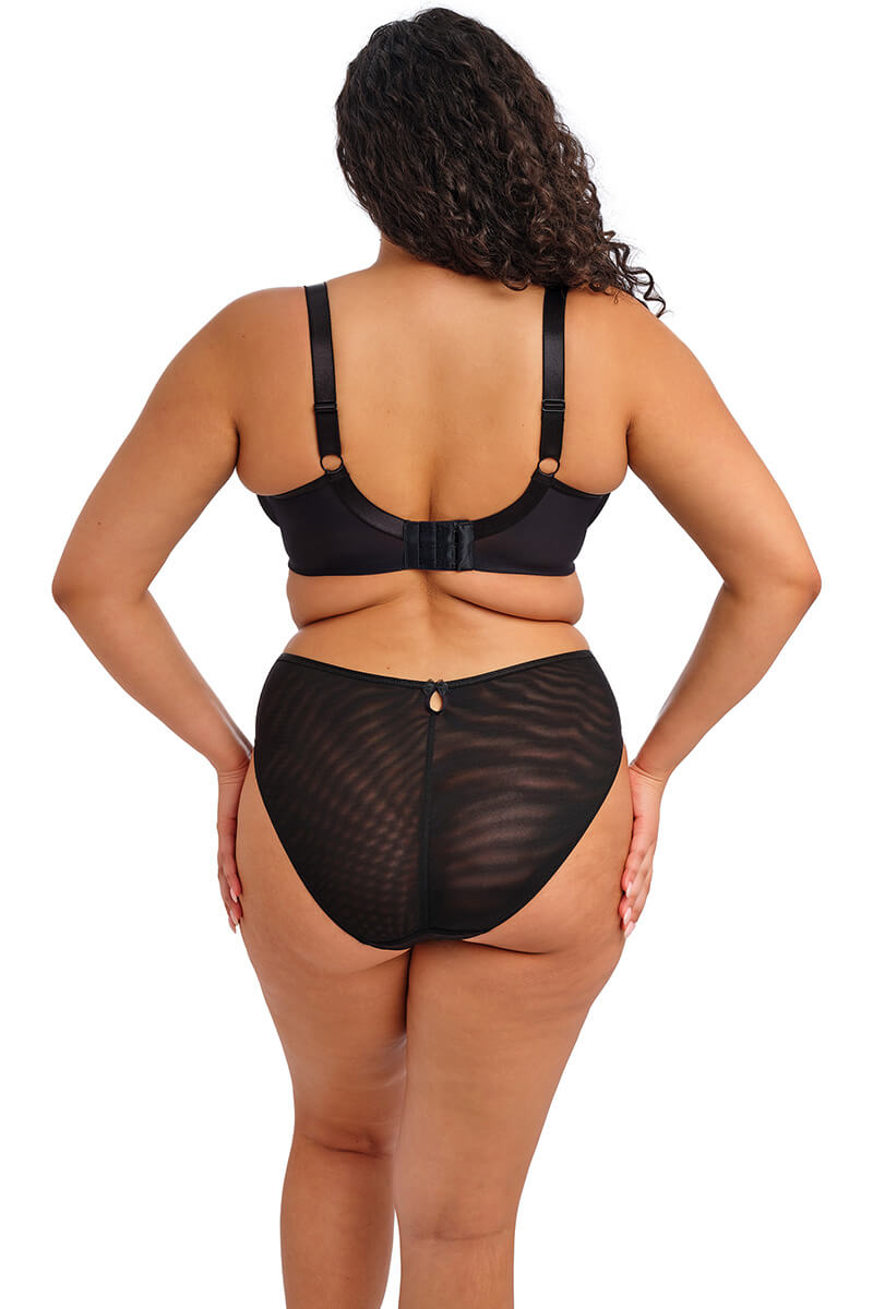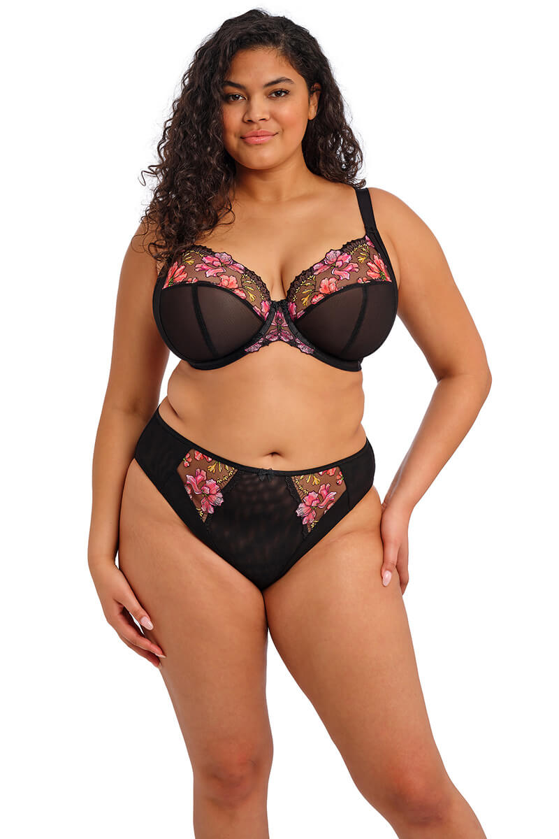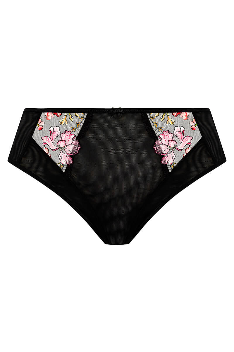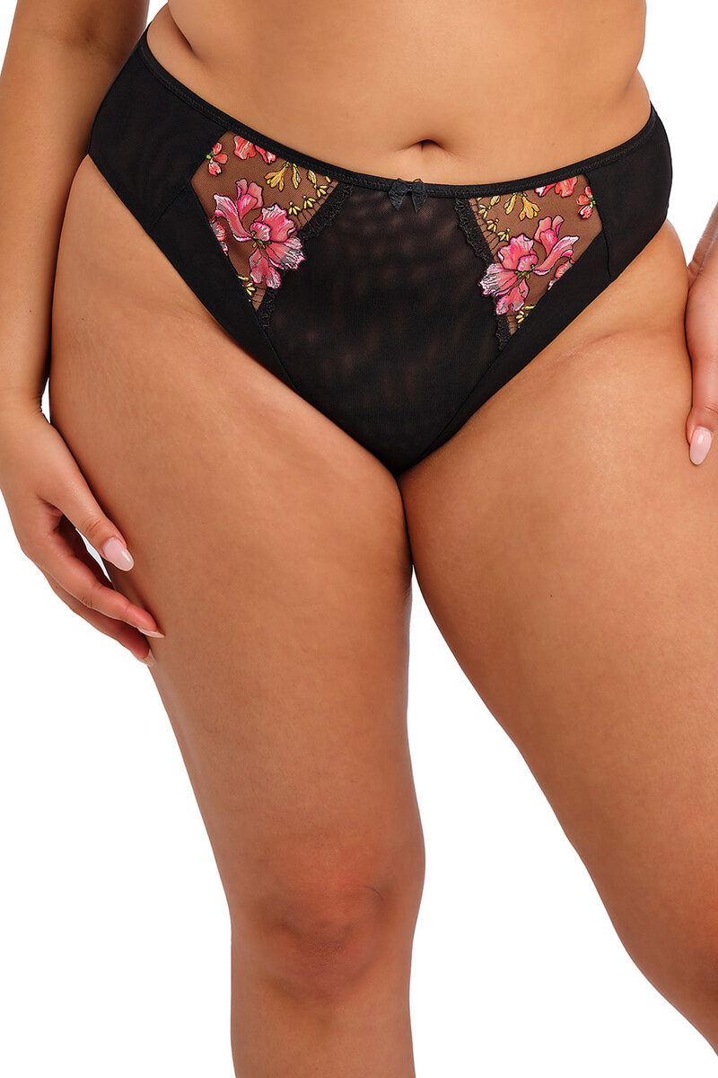 De Elomi Teagan Hoge slip Rainbow is uitgevoerd in een zwarte basis met kleurrijke bloemenborduursels in geel, roze en oranje, afgewerkt met een subtiel metallic draadje voor een lichte glans. De slip heeft een hoge pasvorm en is gemaakt van dubbel stretch mesh aan de voor-, zij- en achterkant voor een comfortabele en mooi aansluitende pasvorm. De voorzijde is afgewerkt met geprint borduurwerk, een gladde satijnlook tailleband en een klein strikje in het midden voor een vrouwelijke touch.
