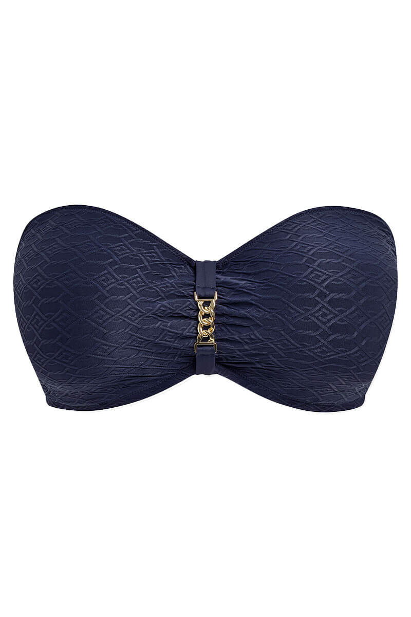 De Fantasie Azores Bandeau bikinitop Midnight is uitgevoerd in een diep donkerblauw luxe, licht gestructureerde stof met een subtiel reliëf. De licht voorgevormde cups geven goede ondersteuning en zorgen voor een mooie, ronde vorm. De verborgen beugel en verstevigde zijkanten zorgen voor extra steun en een stevige pasvorm. De bandjes zijn afneembaar en verstelbaar, en kunnen zowel over de schouders als gekruist op de rug worden gedragen. Afgewerkt met een goudkleurig ketting aan de voorkant dat niet warm wordt in de zon.
