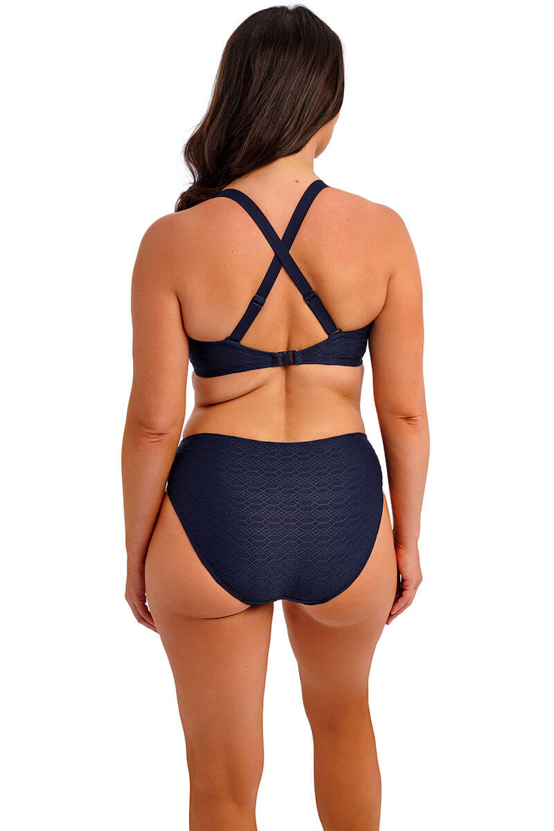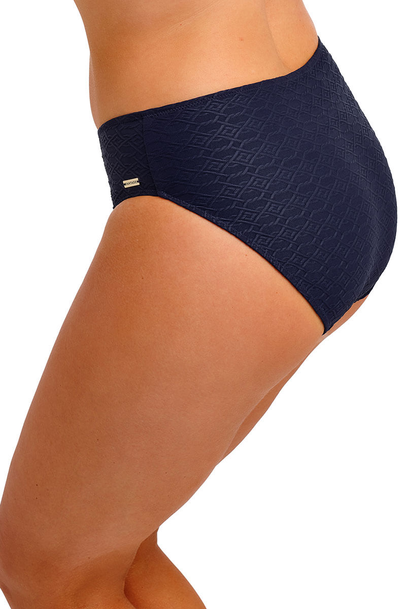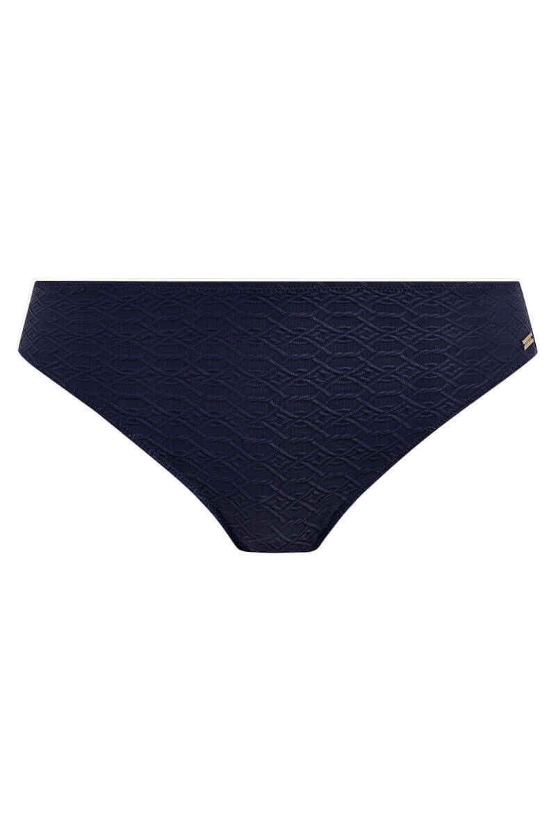 De Fantasie Azores Bikinislip Midnight is uitgevoerd in een diep donkerblauw luxe, licht gestructureerde stof met een subtiel reliëf. De slip is volledig gevoerd en is afgewerkt met een Fantasie logotje dat niet warm wordt in de zon.