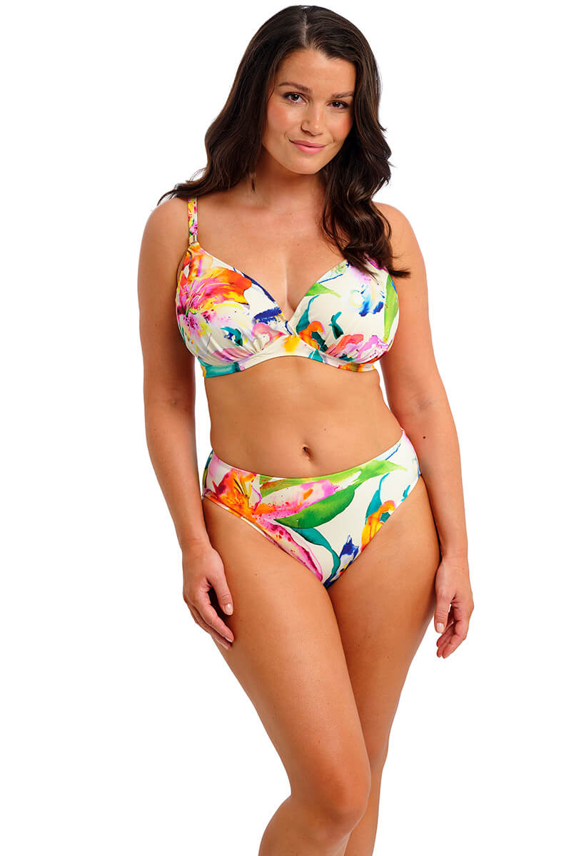 De Fantasie Iguazu Falls Bikinislip Multi is uitgevoerd in een levendige print met felle kleuraccenten op een zachte off-white basis. De combinatie van frisse tinten geeft een vrolijke, zomerse uitstraling. De slip heeft een klassieke pasvorm en is volledig gevoerd.