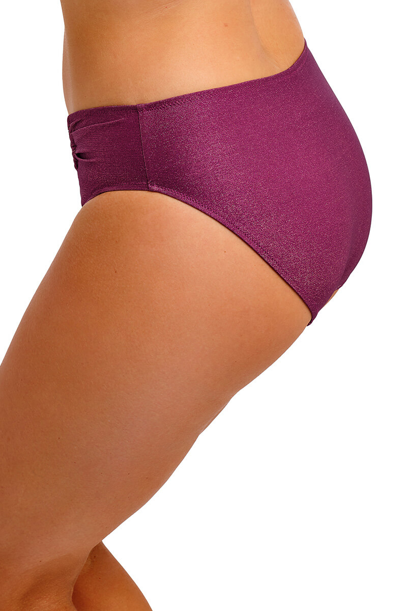 De Fantasie Paros Coast Bikinislip Berry Shimmer is uitgevoerd in paars met subtiele glinsteringen die overal door de stof lopen. De pasvorm van het broekje is normaal, biedt medium bedekking, en is volledig gevoerd. Het broekje is voorzien van een metalen gouden detail voor een luxe touch.