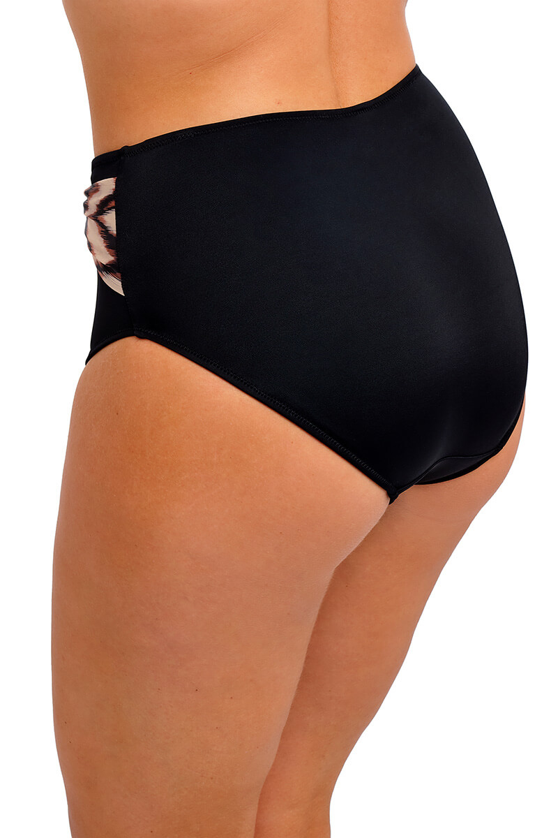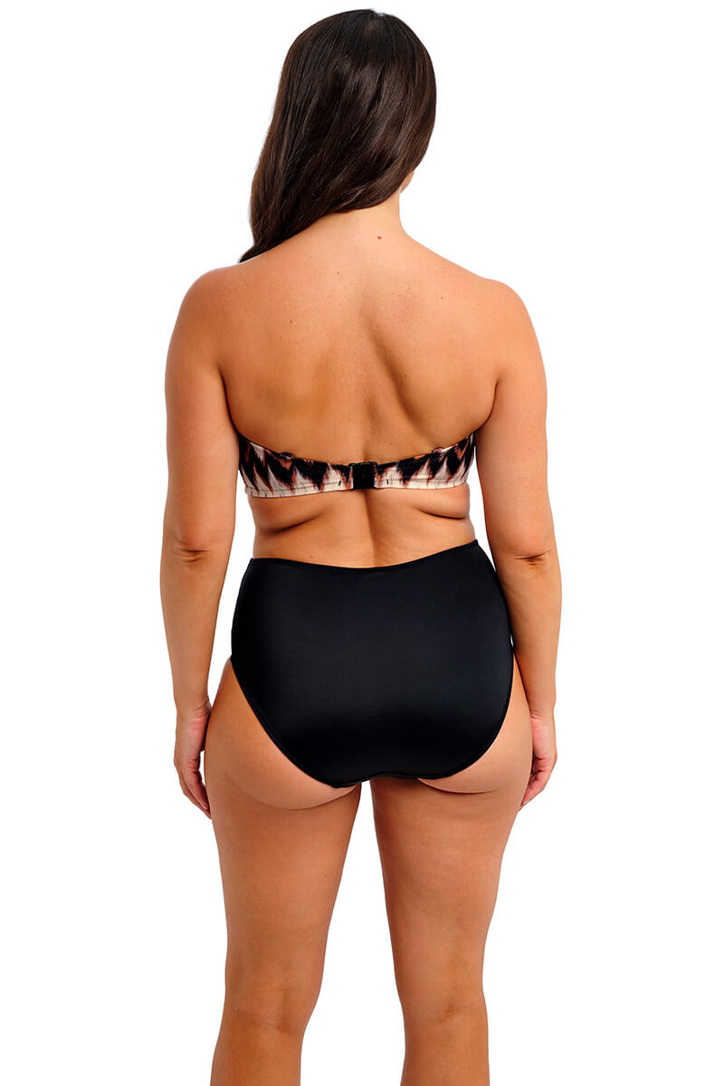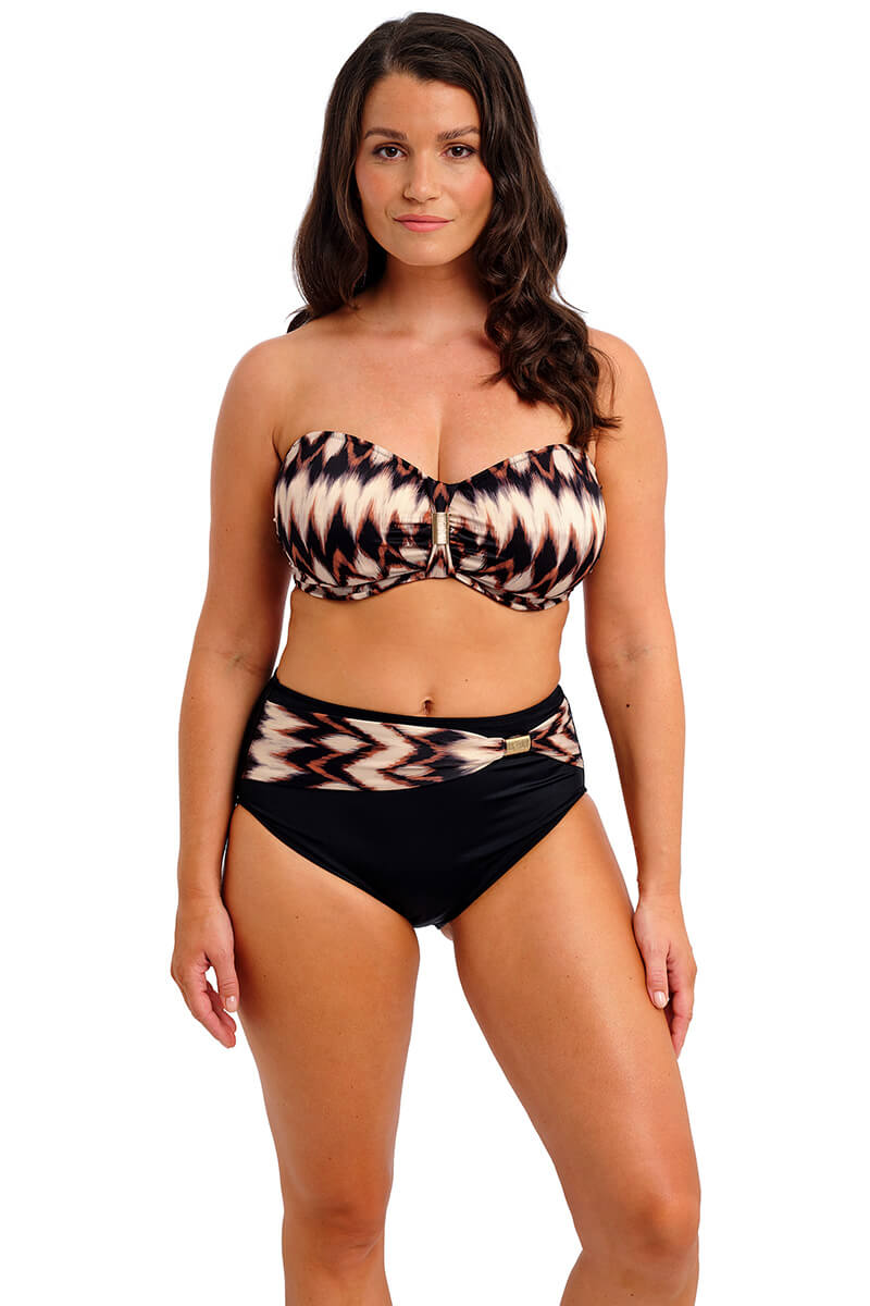 De Fantasie Sabana Hoge Bikinislip Copper Tint is uitgevoerd in een zwarte basiskleur met een brede tailleband in warme koper- en zandtinten. De slip biedt extra bedekking, is volledig gevoerd en heeft een chic goudkleurig detail dat niet heet wordt in de zon.