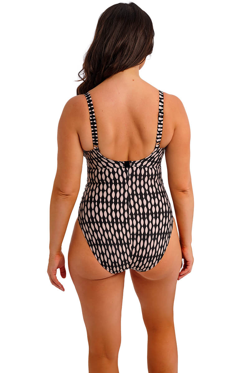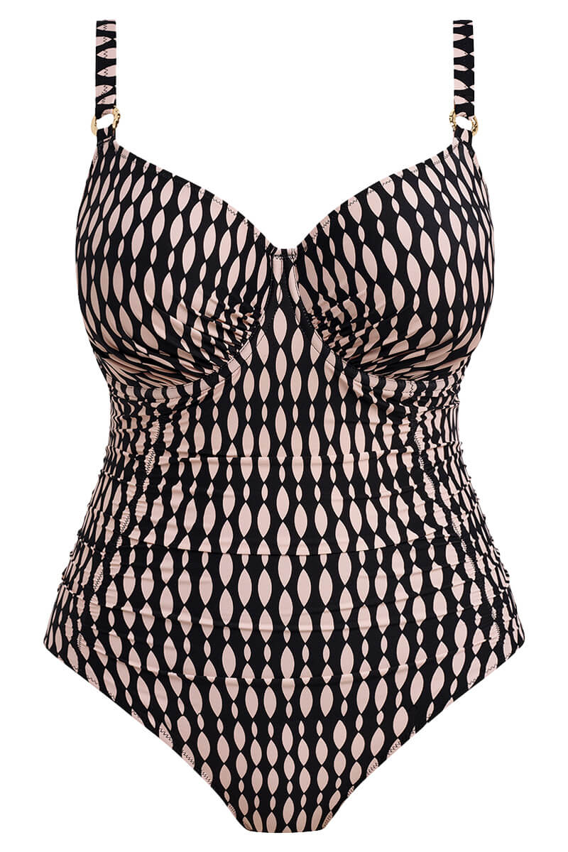 Het Fantasie Shell Bay Badpak Desert Blush is uitgevoerd in een moderne grafische print in zwart met zacht blushroze. Dit badpak draagt comfortabel en geeft een mooie, vrouwelijke vorm. De geplooide cups passen zich goed aan en geven een goede ondersteuning. Het gerimpelde middenstuk helpt de buik subtiel glad te maken. Dankzij de verstevigde zijkanten en verstelbare schouderbandjes draagt het badpak stevig en prettig. Het is volledig gevoerd en afgewerkt met een goudkleurige ring bij de bandjes voor een luxe uitstraling.