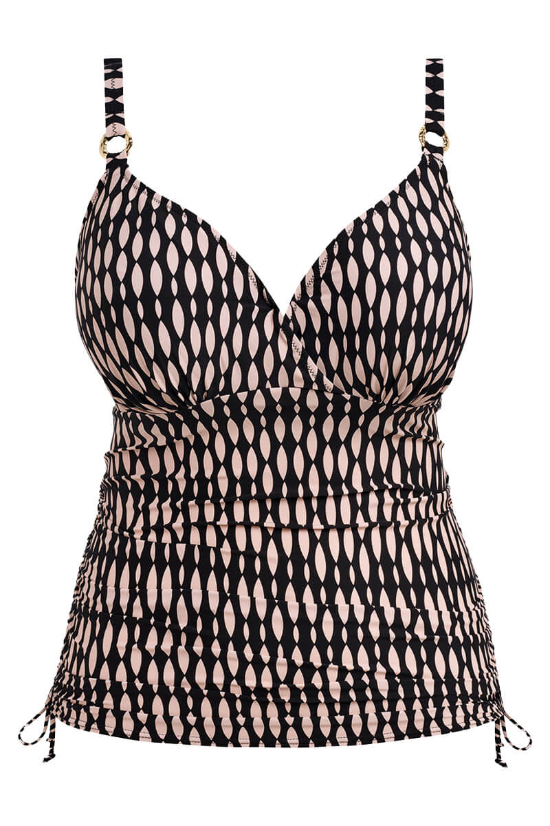 De Fantasie Shell Bay Tankini top Desert Blush is uitgevoerd in een moderne grafische print in zwart met zacht blushroze. Deze tankini heeft een flatterende, vrouwelijke pasvorm en draagt comfortabel. De overslag aan de voorkant geeft een mooie vorm, terwijl de verborgen beugel en verstevigde zijkanten zorgen voor goede ondersteuning. Met de verstelbare strikjes aan de zijkanten kun je de lengte aanpassen en ontstaat er een licht gerimpeld effect dat de buik licht camoufleert. De verstelbare schouderbandjes en het goudkleurige ringdetail maken de tankini top stijlvol en praktisch voor zonnige dagen.