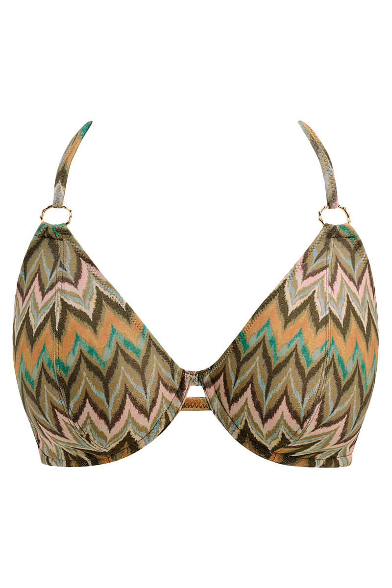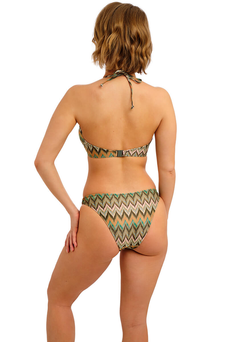 De Freya Arizona Wave Halter bikini top Vista is uitgevoerd in een speelse glitter zigzagprint met golvende lijnen in turquoise, roze, zand, groen en zwart. De subtiele metallic glitter geeft deze collectie een unieke uitstraling. De halterbikini met een diepe halslijn en smalle bandjes zorgt voor een prachtig decolleté, terwijl de goude bamboe ringen het design compleet maken. Stijlvol, comfortabel en klaar om te shinen deze zomer!