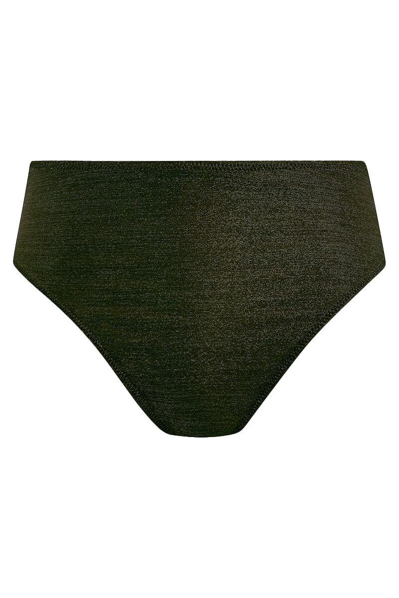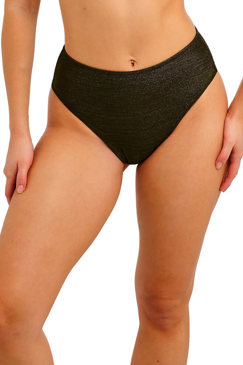 De Freya Arizona Wave High Waist Bikinislip Nebula is gemaakt van een zachte, gladde stof met goud/groene glitter voor een glanzende, luxe look. Het broekje valt hoog op de heupen en is bij de benen hoog uitgesneden waardoor er een toffe retro look wordt gecreëerd.