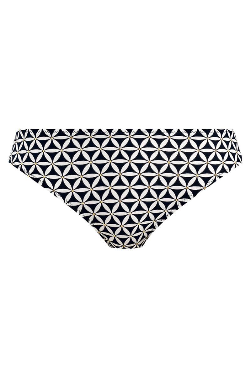 De Freya Koh Tao Bikinislip Black van Freya Swim is uitgevoerd in een grafische zwart-witte retroprint met een subtiele goudkleurige stip. Deze slip heeft een normale pasvorm.