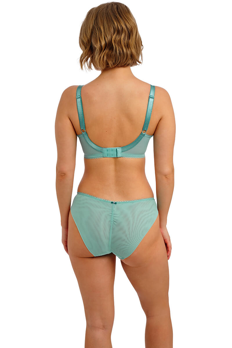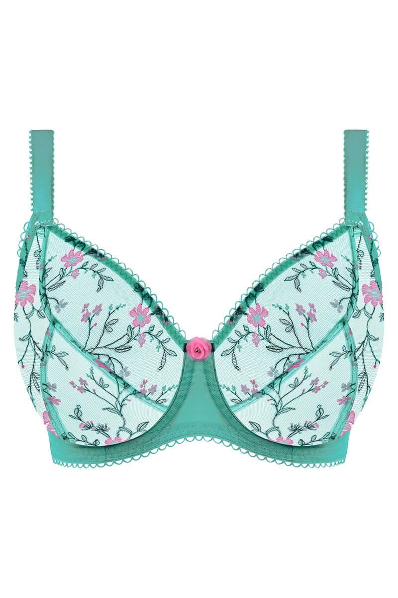 De Freya Love Crush Plunge BH Aqua Haze is uitgevoerd in aqua met verfijnde bloemenborduursels over doorschijnende stof. De lage voorkant geeft een mooi decolleté en de contrasterende randjes en het roosje in het midden maken deze BH extra leuk. De zijkanten geven goede steun en de bandjes zijn helemaal verstelbaar, zodat ze goed blijven zitten.