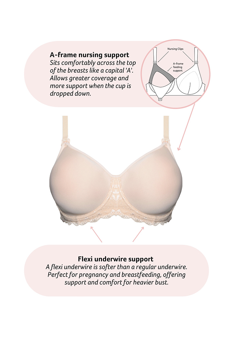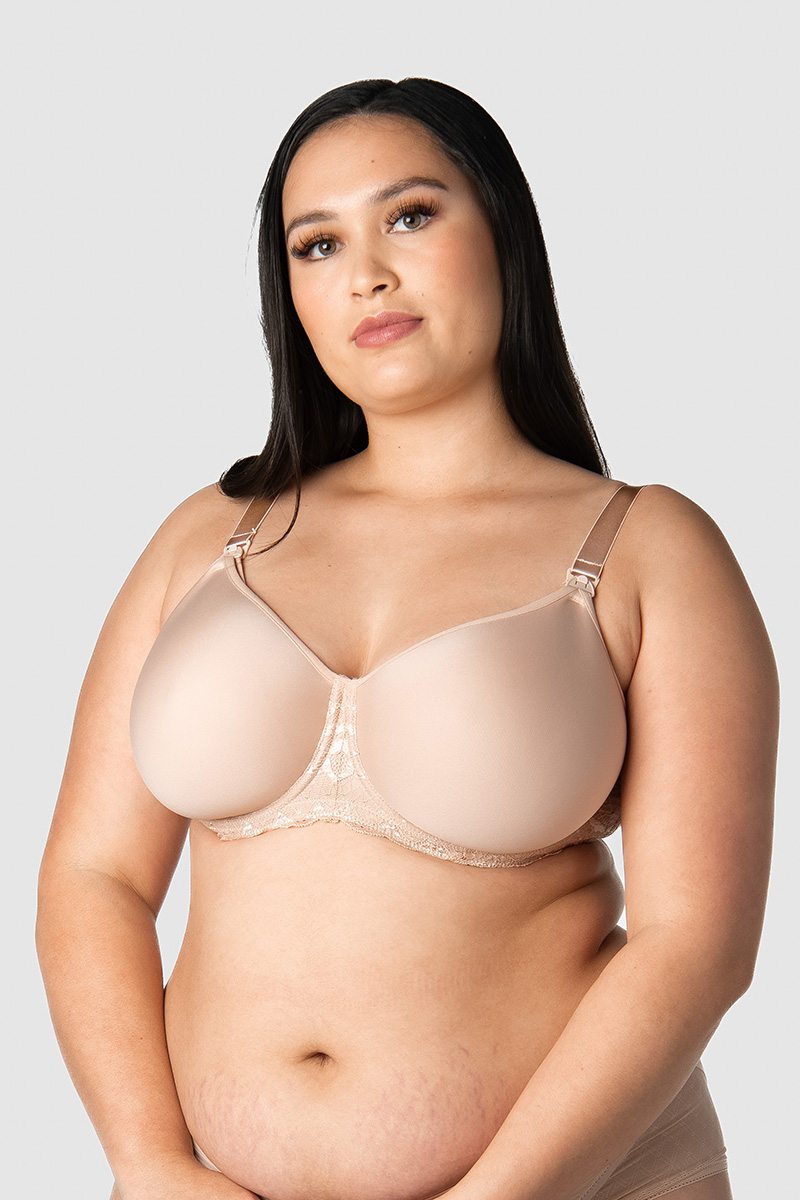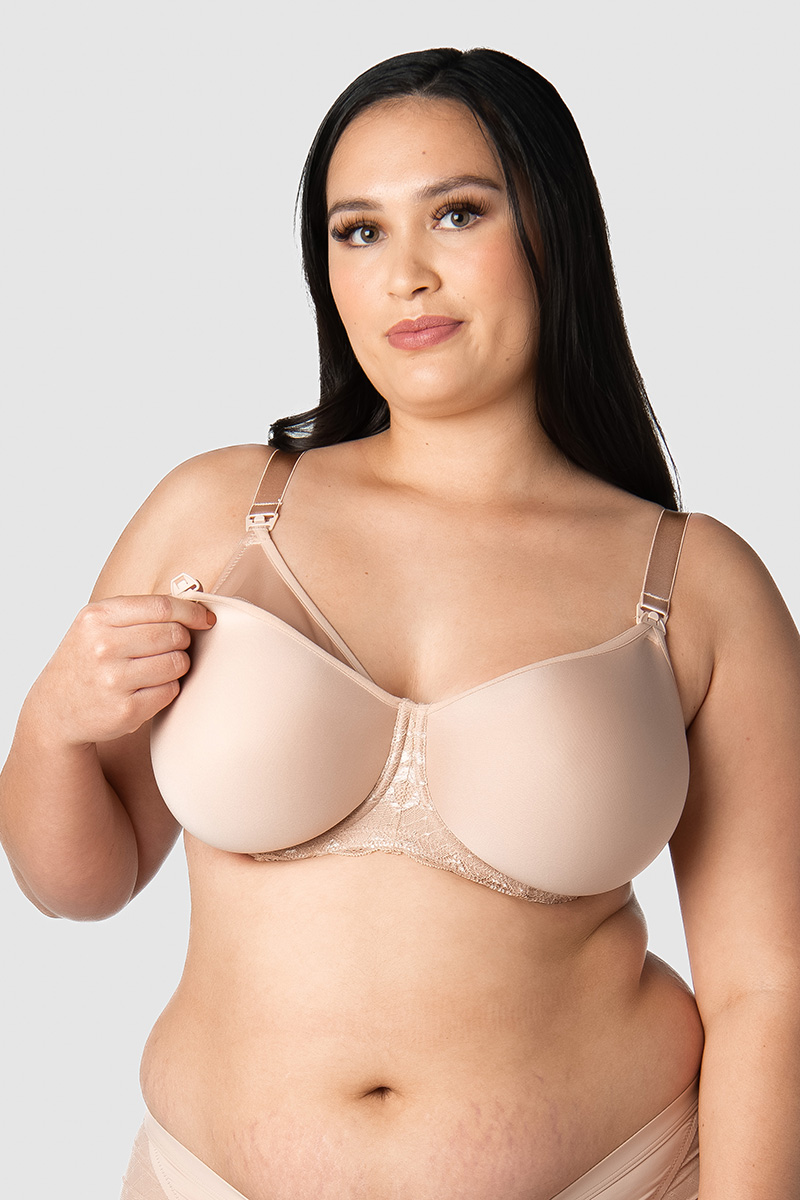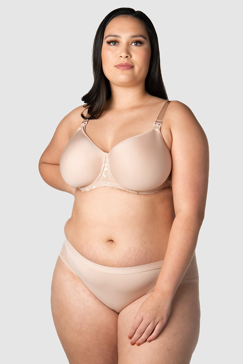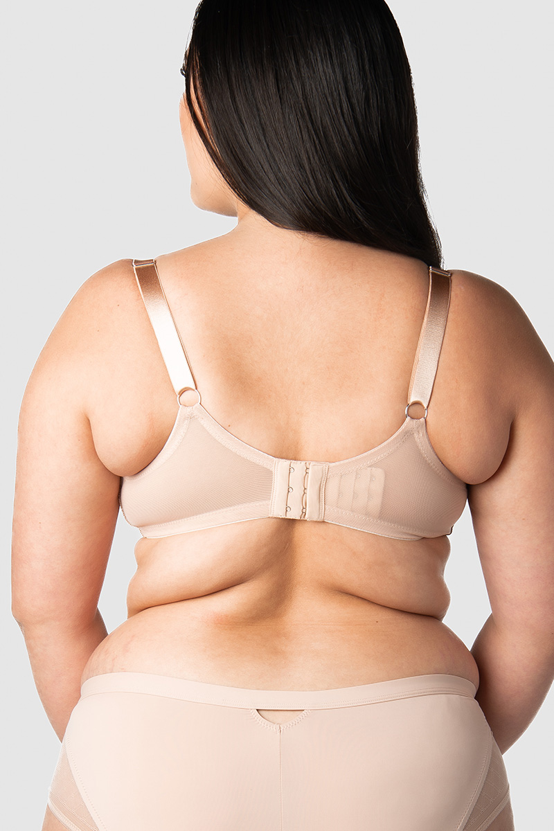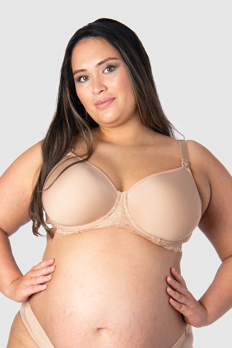 De Hotmilk VoedingsBH Obsession Cashmere uitgevoerd in beige. De zij- en onderkant van de cups zijn subtiel afgewerkt met kant. Deze gladde voedingsBH gaat tot cupmaat H en is voorzien van beugels voor voldoende stevigheid. De cups zijn gemaakt van een dubbele laag stof met daartussen een luchtlaag. Ademend en super licht dus. De voedingsBH is voorzien van een dropdown-clip. De schouderbandjes staan op de rug wat meer naar het midden waardoor ze niet afzakken. Een ideale voedingsBH voor de borstvoedingsperiode.