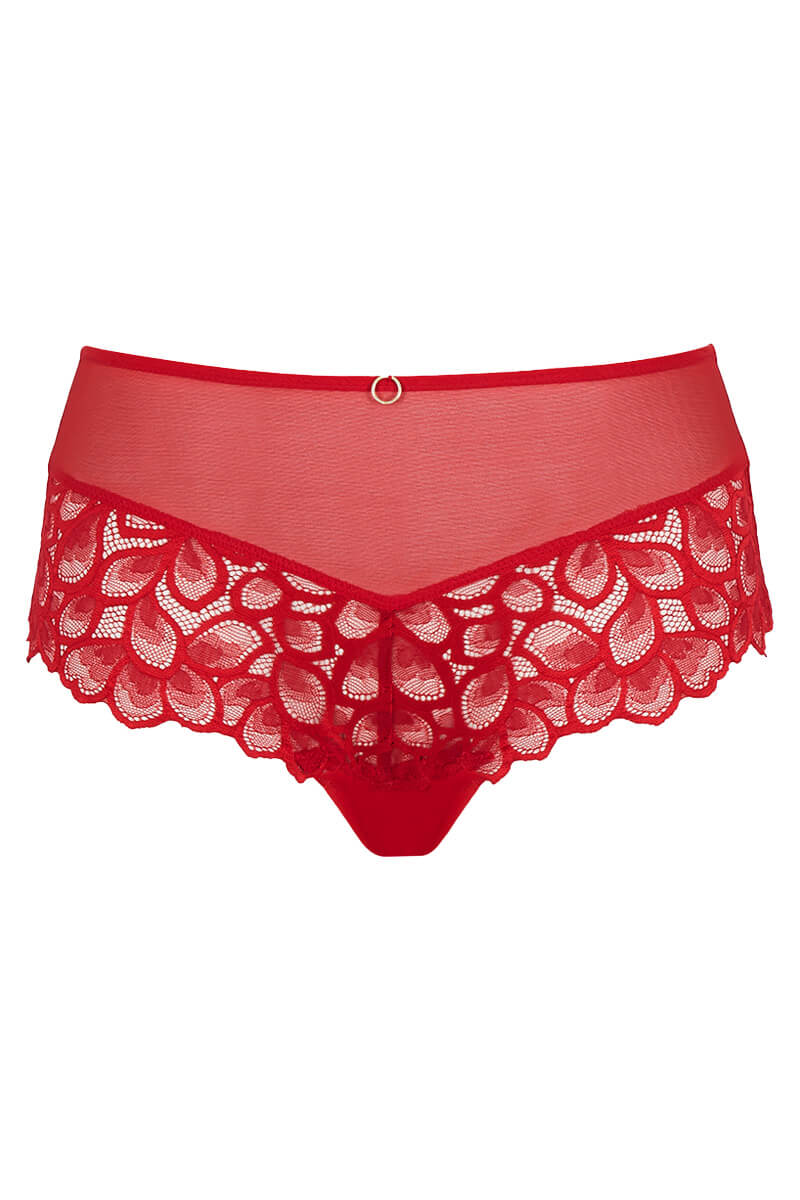Draag de Panache Allure High waist brazilian True Red in de kleur rood met de bijbehorende BH uit deze serie voor een perfecte look. De slip is semi-transparant en heeft een katoenen kruisje.