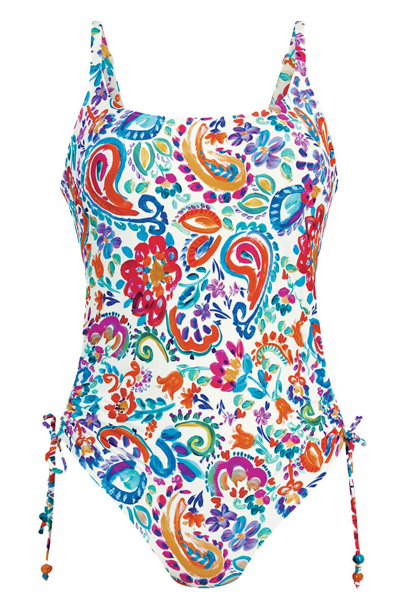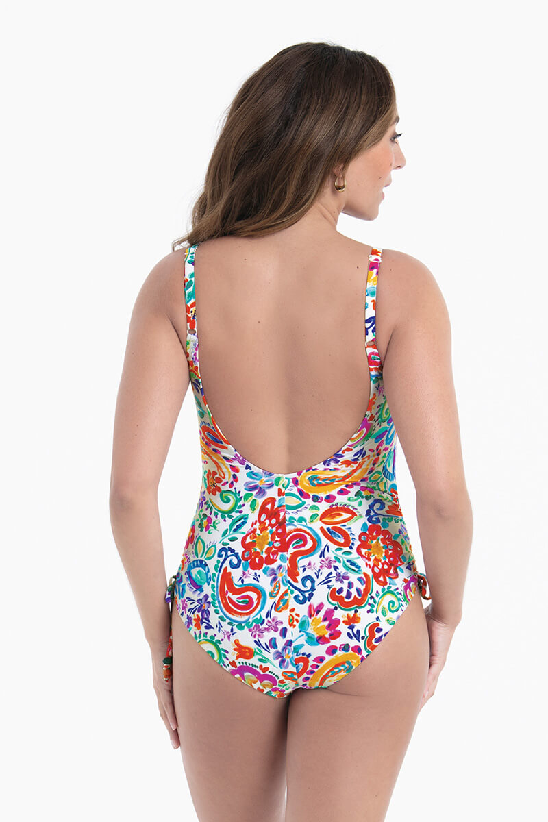 Het Rosa Faia Bianca Badpak Treasure Diving is uitgevoerd in een speelse en kleurrijke print op een witte achtergrond. De ronde halslijn en verstelbare bandjes zorgen voor een goede en persoonlijke pasvorm. De rijgdetails aan de zijkant maken het mogelijk om de hoogte van de beenuitsnijding aan te passen.