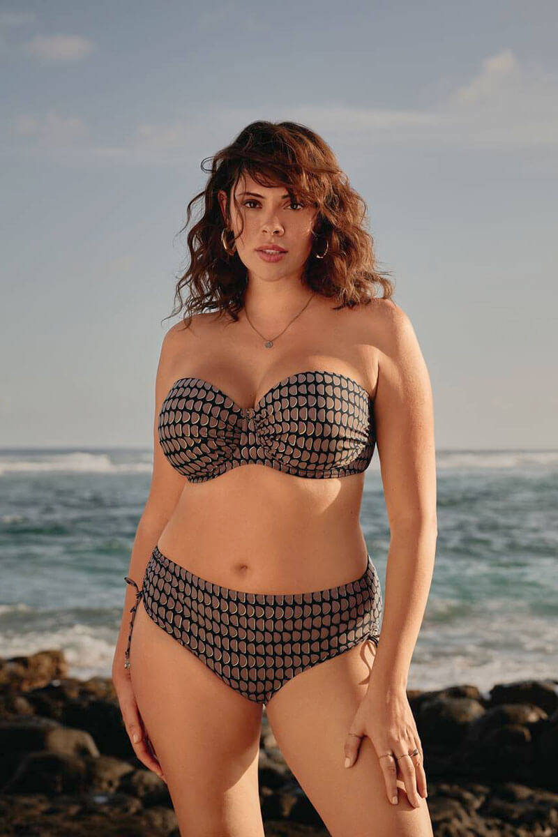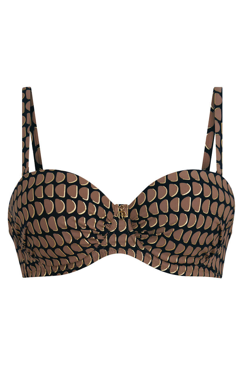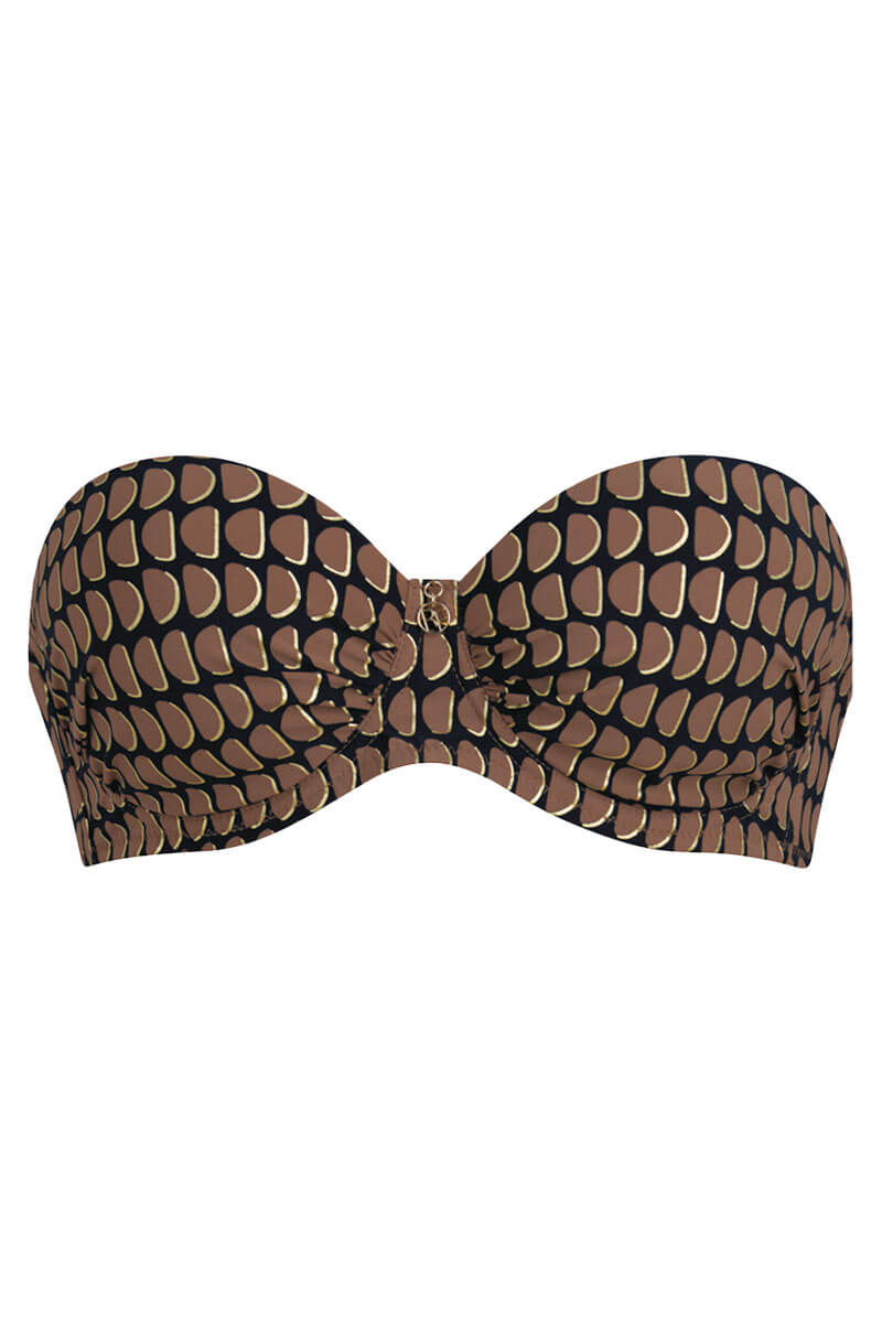 De Rosa Faia Cosima Bandeau bikini top Java Beach is uitgevoerd in een bruine geometrische print met gouden details op een zwarte achtergrond. De top combineert stijl en ondersteuning in één. Het model is ook strapless als bandeau te dragen en heeft beugelcups voor een mooie vorm en stevige pasvorm. De zachte Soft-Touch stof zorgt voor comfortabel draaggevoel, terwijl de verstelbare bandjes en aangepaste pasvorm per maat extra ondersteuning bieden.