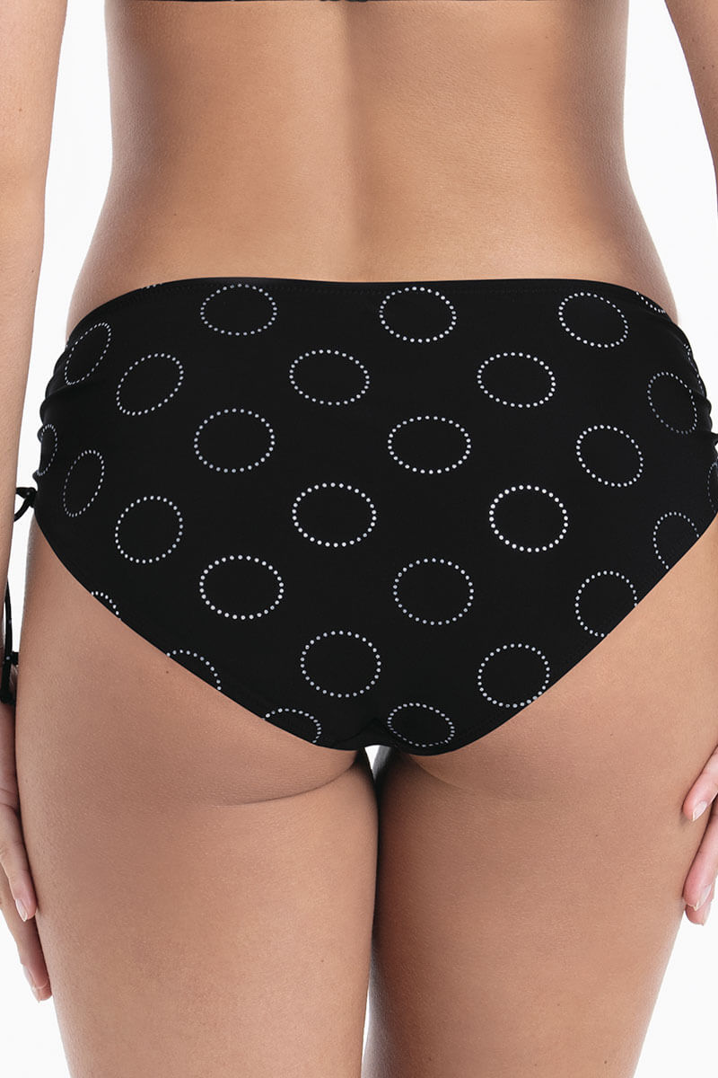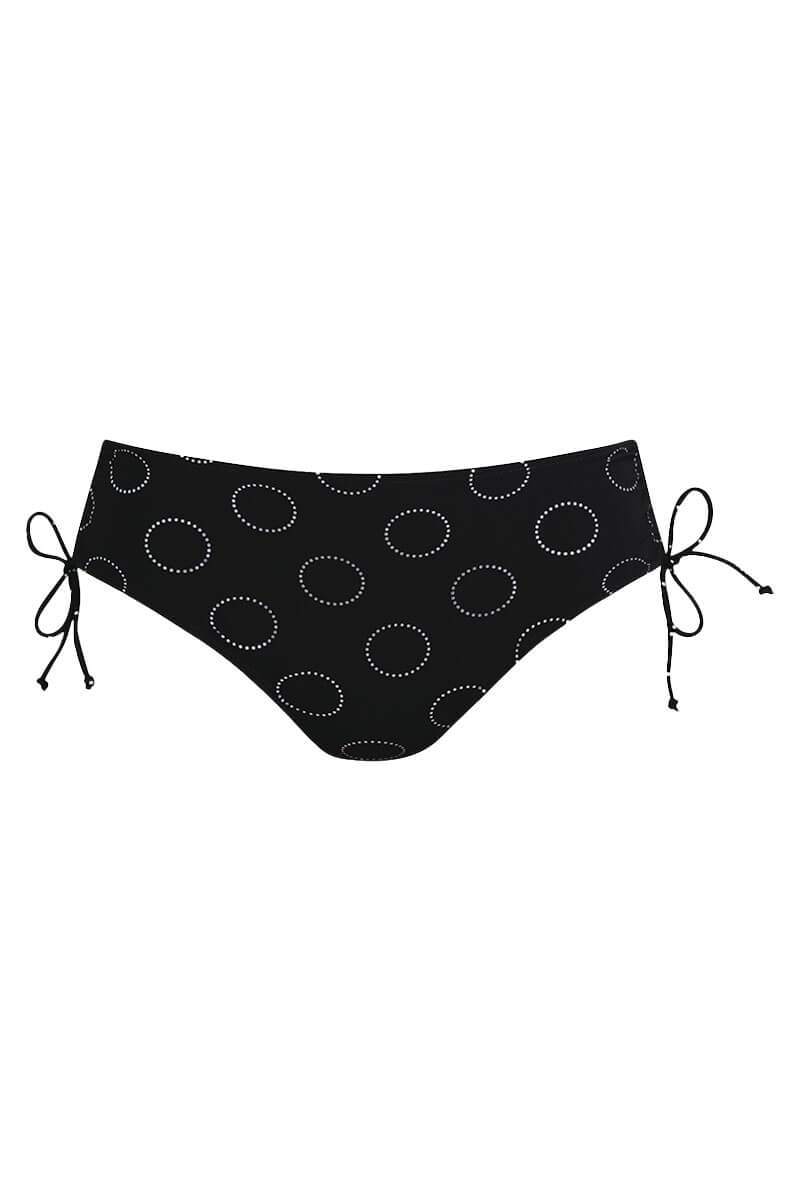 De Rosa Faia Rijgslip Anny Silver Pearls is uitgevoerd in een tropische bloemenprint met zilveren cirkels op een zwarte achtergrond.. Het bikinibroekje heeft een hoge taille en plooitjes aan de zijkanten, die met smalle bandjes verstelbaar zijn voor een fijne pasvorm. De slip is volledig gevoerd en biedt comfortabele, medium bedekking.