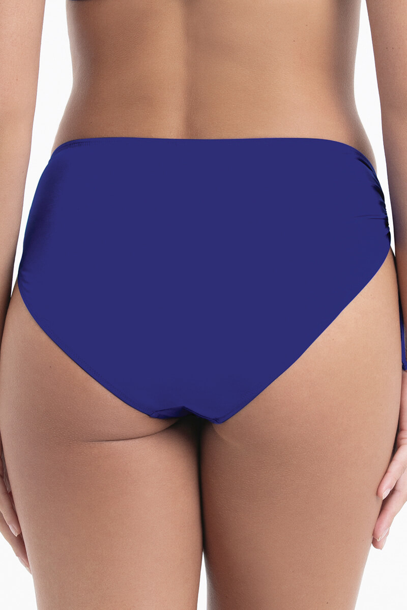 De Rosa Faia Shiny Basics Rijgslip Anny Blue Violet is uitgevoerd in effen kobalt blauw. Het bikinibroekje heeft een hoge taille en plooitjes aan de zijkanten, die met smalle bandjes verstelbaar zijn voor een fijne pasvorm. De slip is volledig gevoerd en biedt comfortabele, medium bedekking.