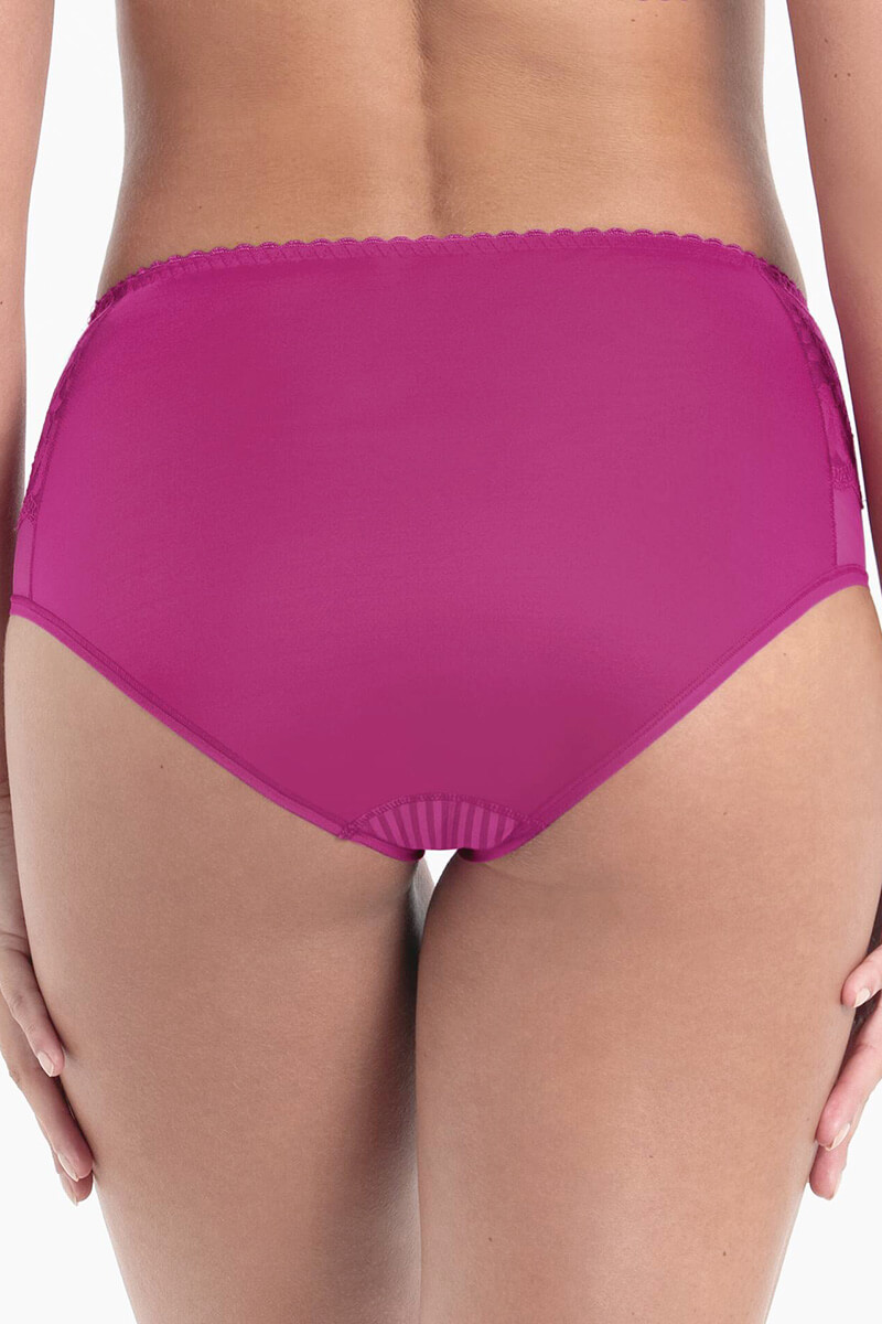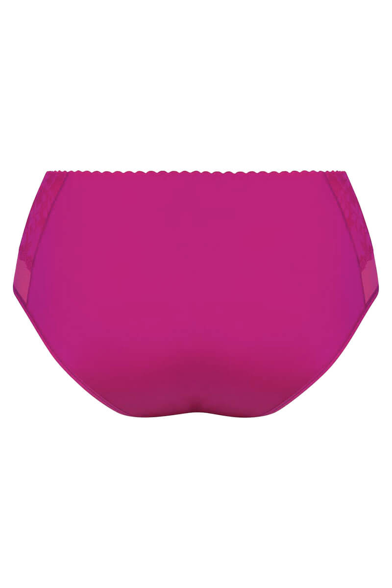 De Rosa Faia Sita Slip Candy Pink in de kleur hard roze en is een lust voor het oog. De voorkant is ontworpen in prachtig luxe kant, het middelste gedeelte heeft een gladde stof met een gestreept patroon. Een leuk detail is het gouden hangertje aan de rand van de slip. Het kruisje is gemaakt van katoen.