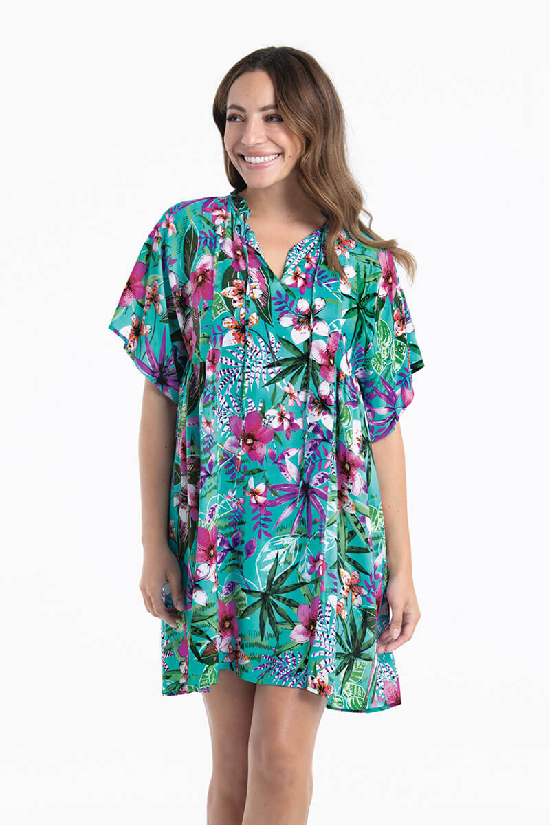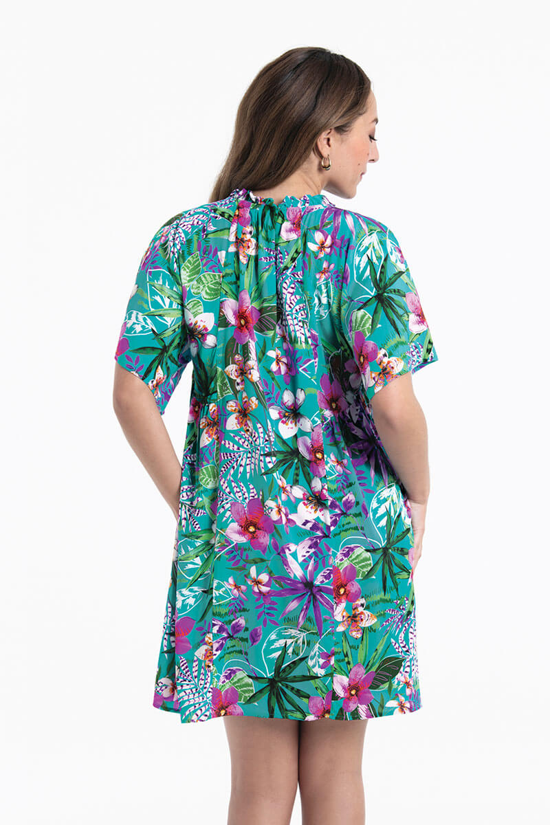 De Rosa Faia Tuniek Tahiti Aloha is uitgevoerd in een frisse turquoise kleur met een opvallende, tropische bloemenprint in roze, paars, wit en groen. Dit strandjurkje heeft een ruimvallende, iets oversized pasvorm en draagt heerlijk luchtig en comfortabel. De hals is afgewerkt met speelse ruches en strikjes, waarmee je de pasvorm makkelijk aanpast.