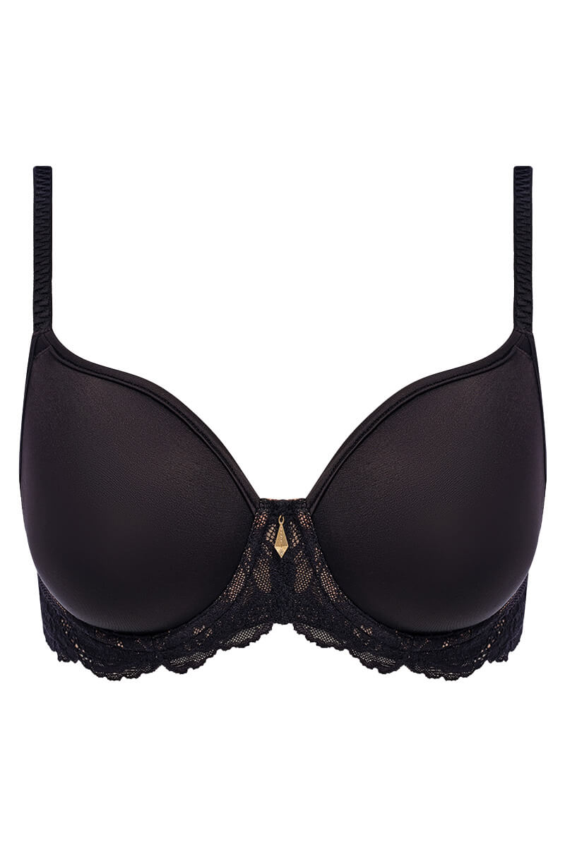 De Wacoal Vivid Attraction Voorgevormde BH Black is uitgevoerd in zwart. Deze naadloze T-shirt bh heeft cups van stretch foam voor een comfortabel en natuurlijk model. De band en middenvoor is afgewerkt met kant met een opvallend bloemenpatroon en een golvende rand. De bh heeft verstelbare sierlijke bandjes met goudkleurige details en een haak-en-oog sluiting aan de achterkant voor een perfecte pasvorm